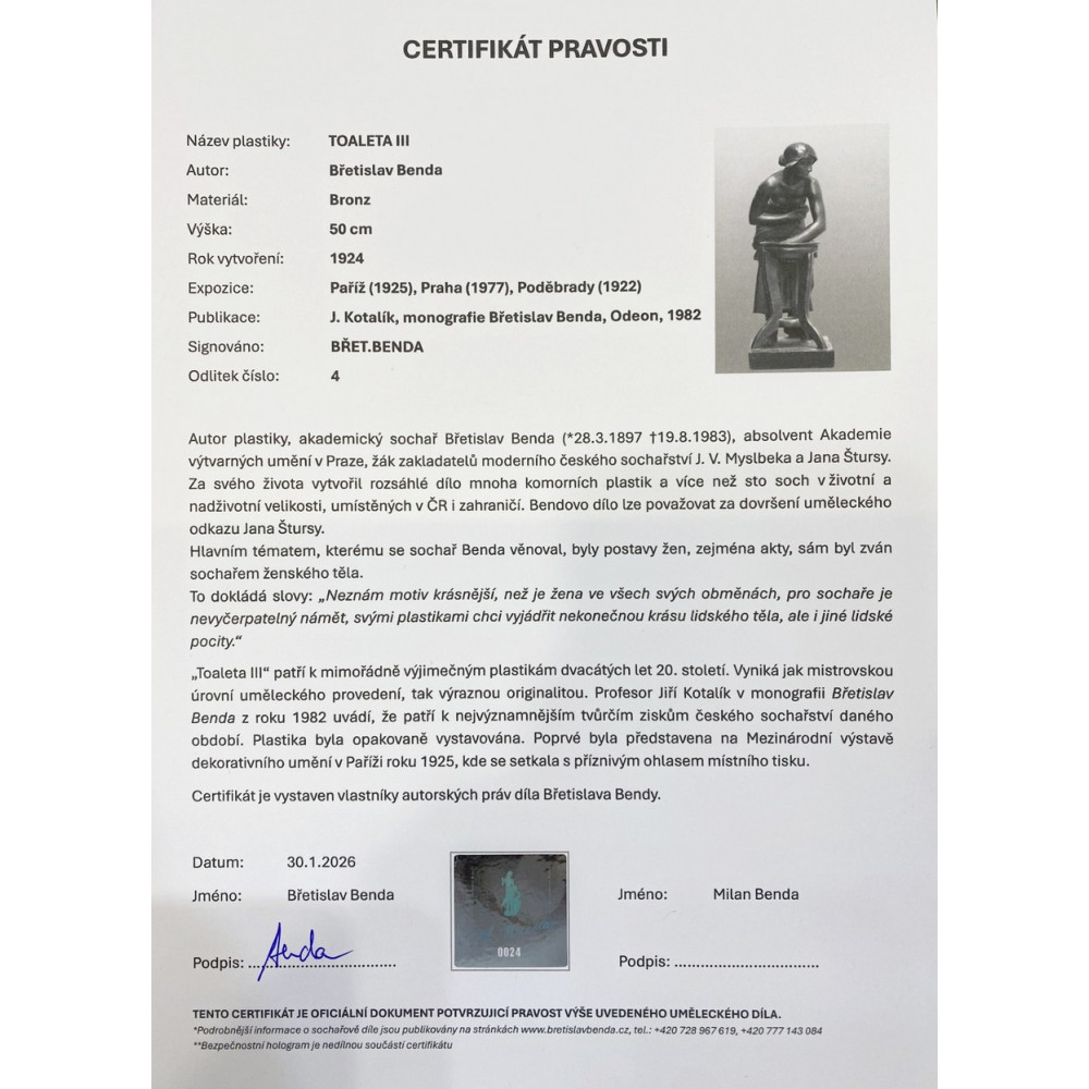 Bronzová plastika s názvem „Toaleta III“ od českého akademického sochaře Břetislava Bendy patří k mimořádným dílům z 20. let 20. století. Vyniká jak mistrovskou úrovní uměleckého provedení, tak výraznou originalitou. Plastika byla opakovaně vystavována. Poprvé byla představena na Mezinárodní výstavě dekorativního umění v Paříži roku 1925, kde se setkala s příznivým ohlasem místního tisku. K předmětu je vystaven certifikát pravosti (viz fotografie).
