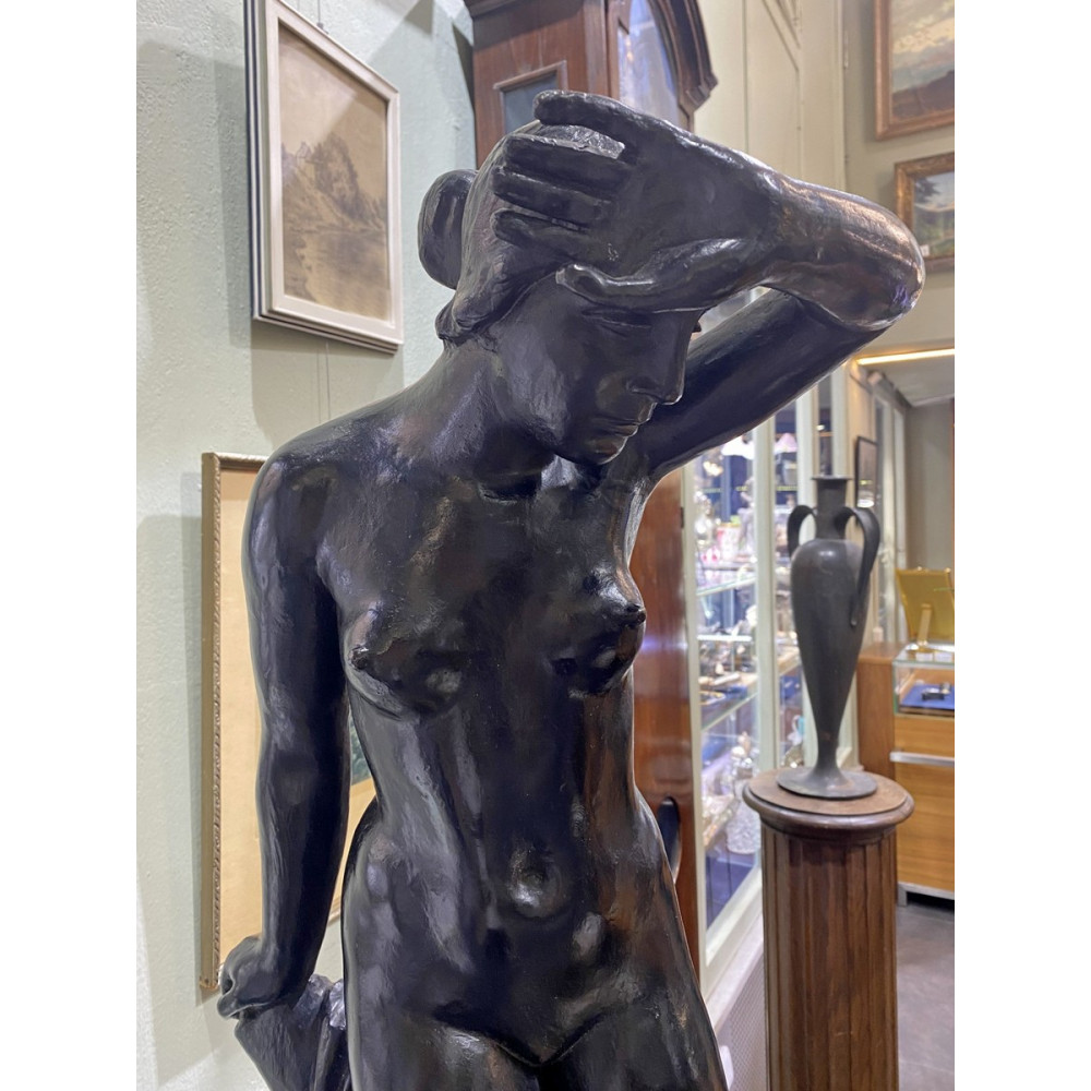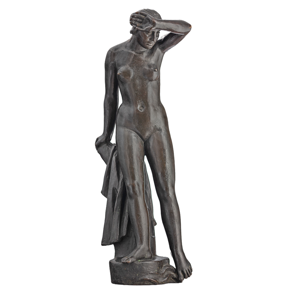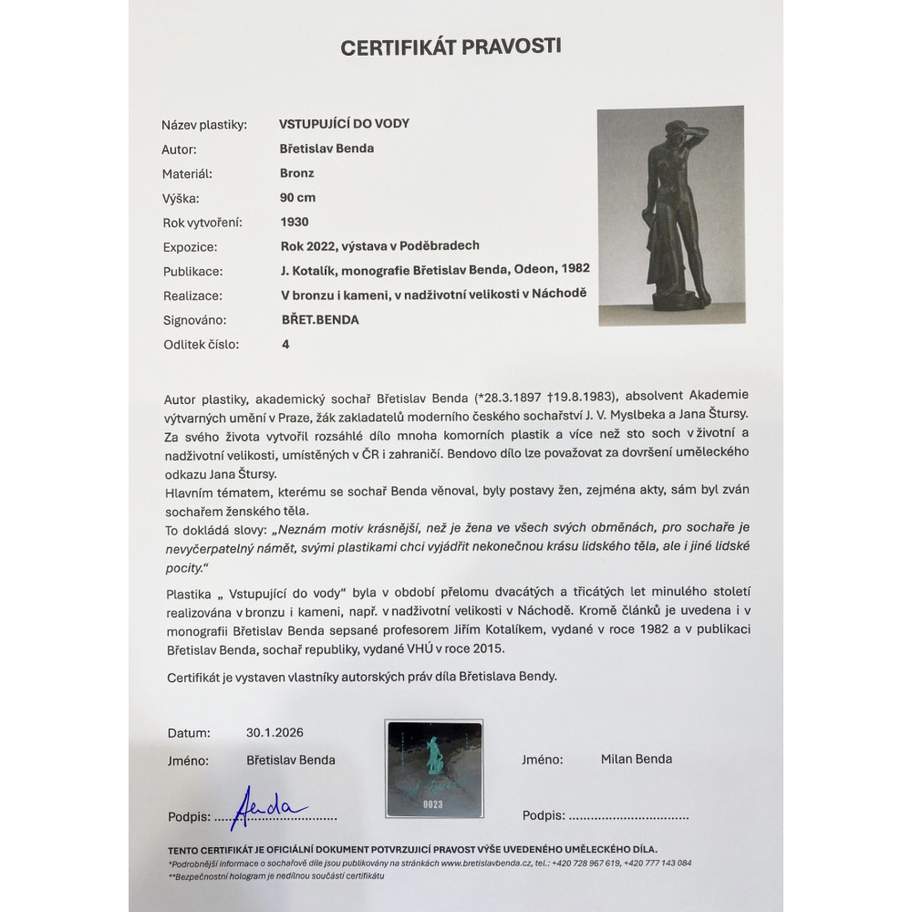 Plastika "Vstupující do vody" od českého akademického sochaře Břetislava Bendy byla v období přelomu dvacátých a třicátých let minulého století realizována v bronzu i kameni, např. v nadživotní velikosti v Náchodě. Kromě článků je uvedena i v monografii Břetislav Benda sepsané profesorem Kotalíkem a vydané v roce 1982, a v publikaci Břetislav Benda, sochař republiky, vydané v roce 2025. K předmětu je vystaven certifikát pravosti (viz fotografie).
