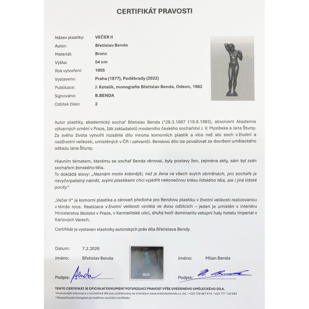 Bronzová plastika s názvem „Večer II“ od českého akademického sochaře Břetislava Bendy byla původně komorní předlohou pro plastiku v životní velikosti, která byla realizovaná ve dvou odlitcích - jedna se stala dominantou vstupní haly hotelu Imperial v Karlových Varech a druhá je umístěna v interiéru Ministerstva školství v Praze, v Karmelitské ulici. K předmětu je vystaven certifikát pravosti (viz fotografie).