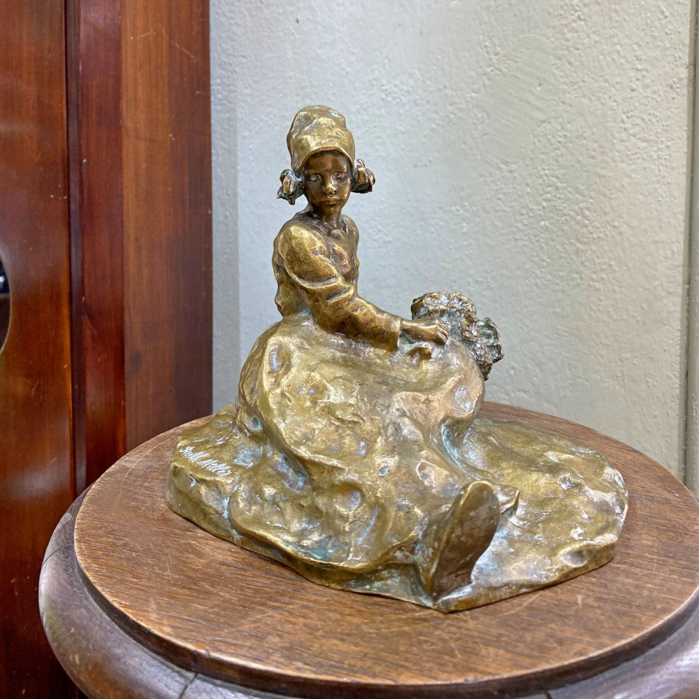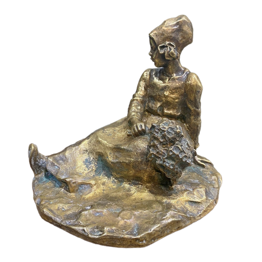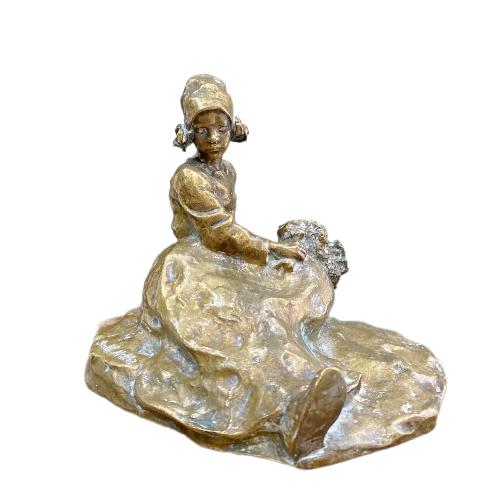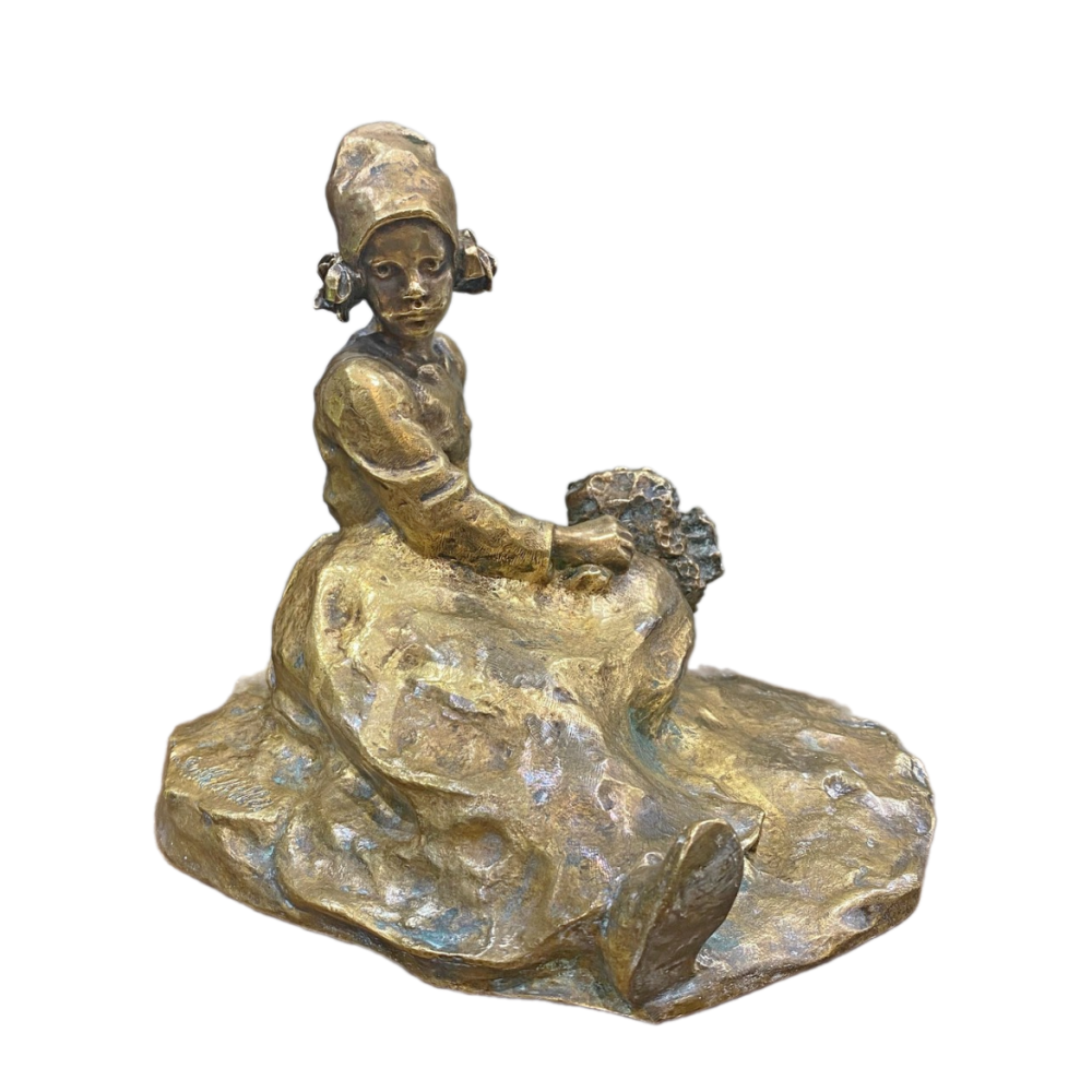 Menší socha sedící dívky v bretaňském kroji, držící kytici květin v ruce. Dílo v impresionistickém stylu vytvořila na počátku 20. století talentovaná švédská sochařka Ruth Milles (1873-1941). Signováno na podstavci. Odlito v Paříži u Louise Eugèna Blota (1857-1938). Materiálem je zlatě patinovaný bronz.