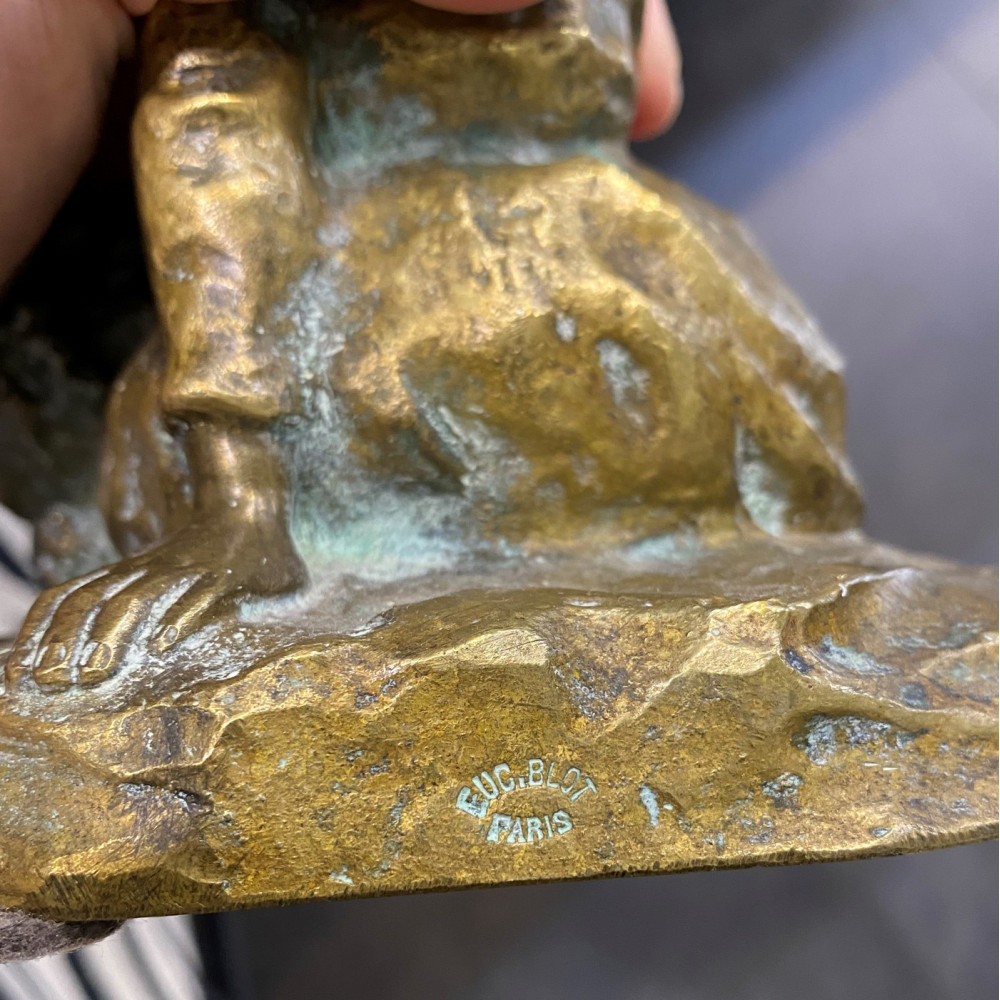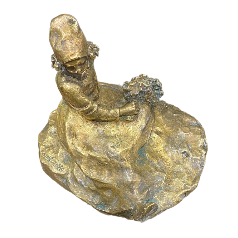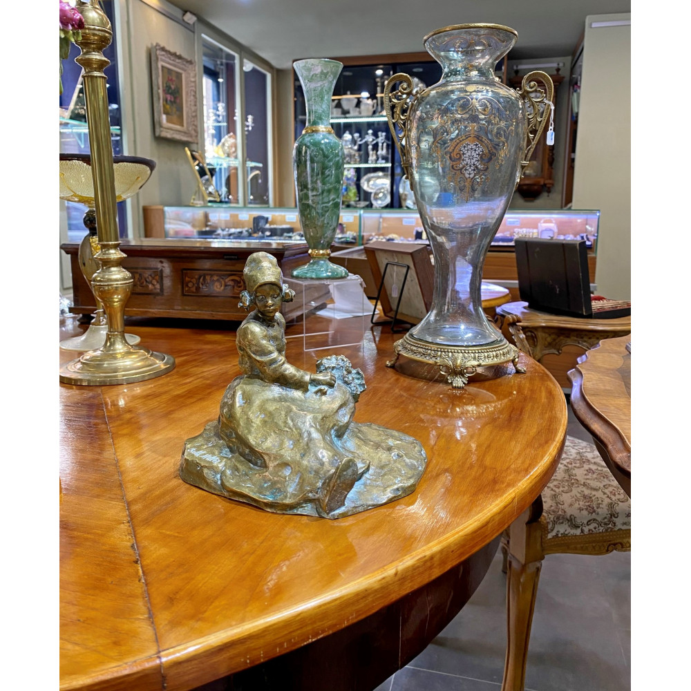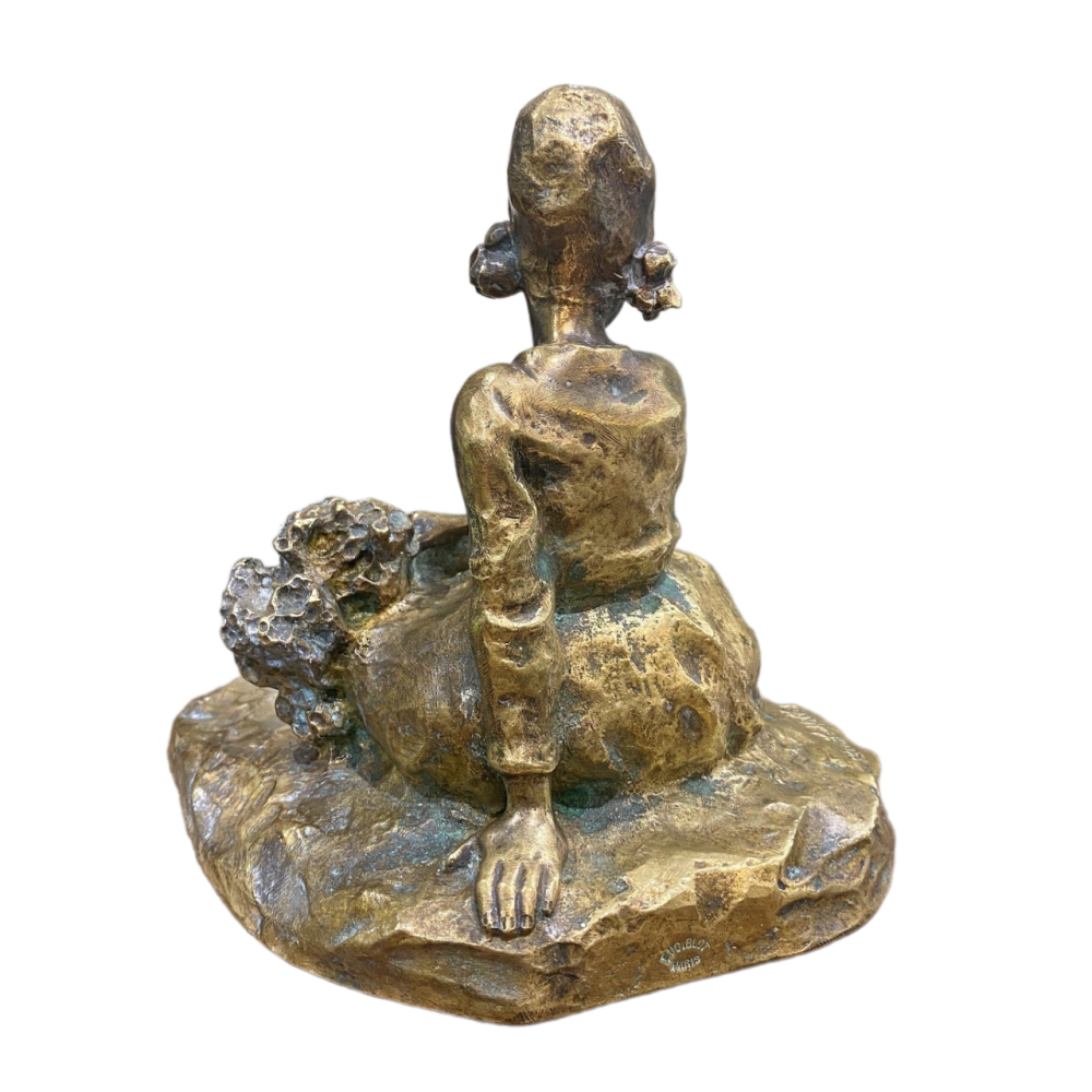 Menší socha sedící dívky v bretaňském kroji, držící kytici květin v ruce. Dílo v impresionistickém stylu vytvořila na počátku 20. století talentovaná švédská sochařka Ruth Milles (1873-1941). Signováno na podstavci. Odlito v Paříži u Louise Eugèna Blota (1857-1938). Materiálem je zlatě patinovaný bronz.