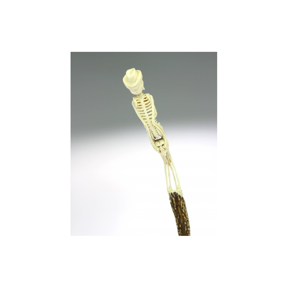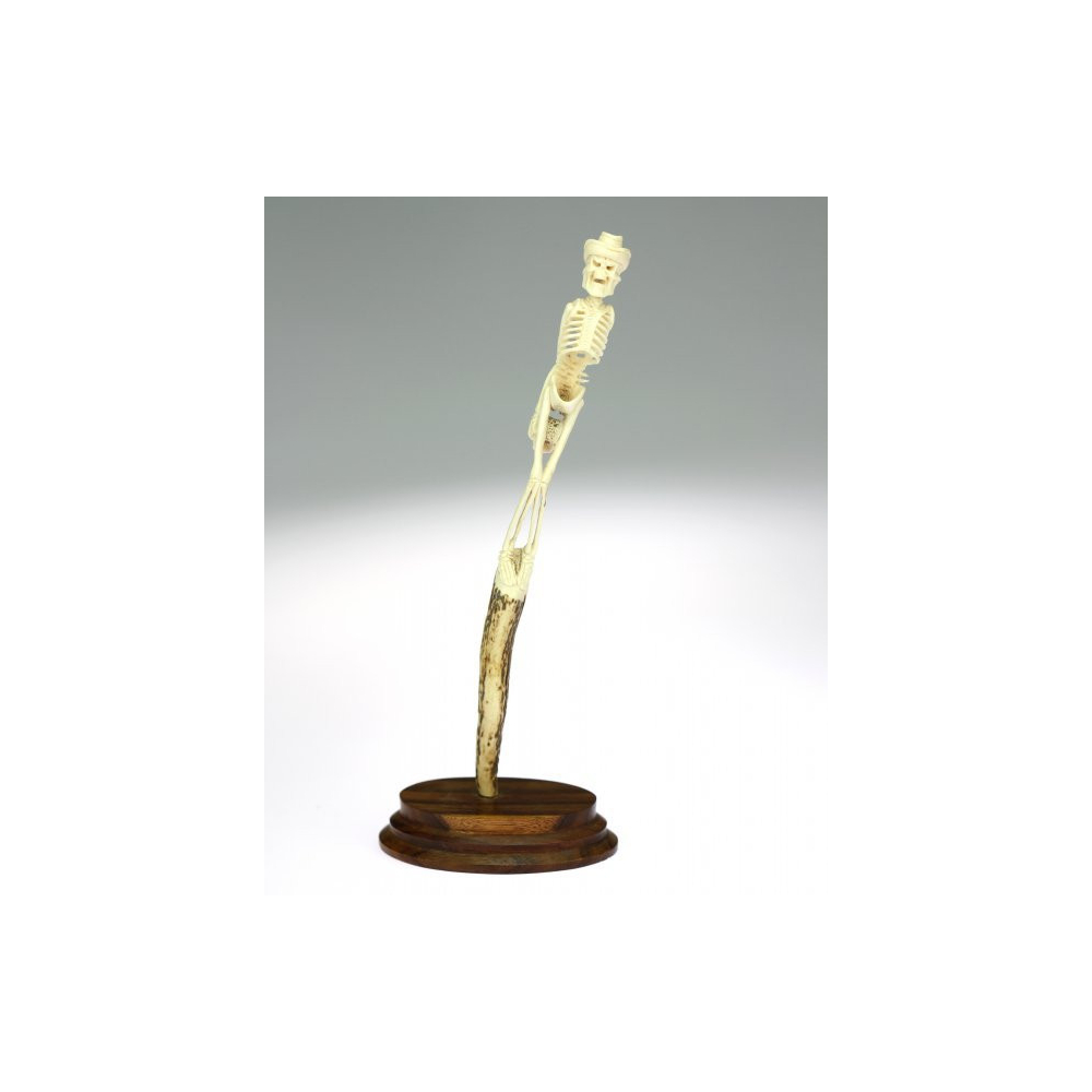 Z rohoviny vyřezávaná figurka kostlivce s kloboukem připevněná na dřevěném podstavci.