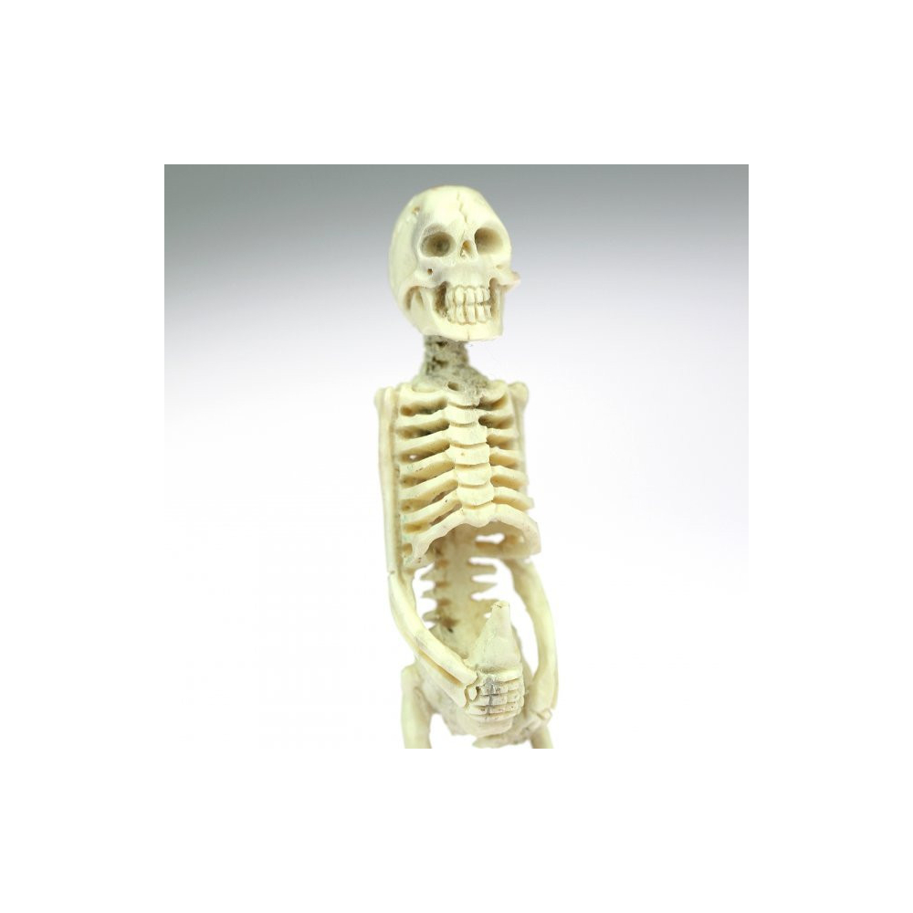 Z rohoviny vyřezávaná figurka kostlivce s lahví připevněná na dřevěném podstavci.