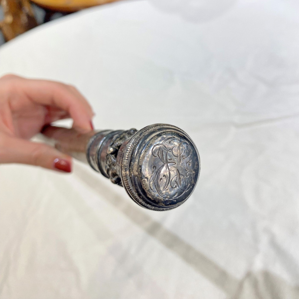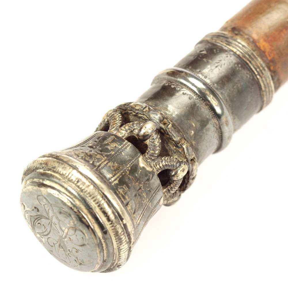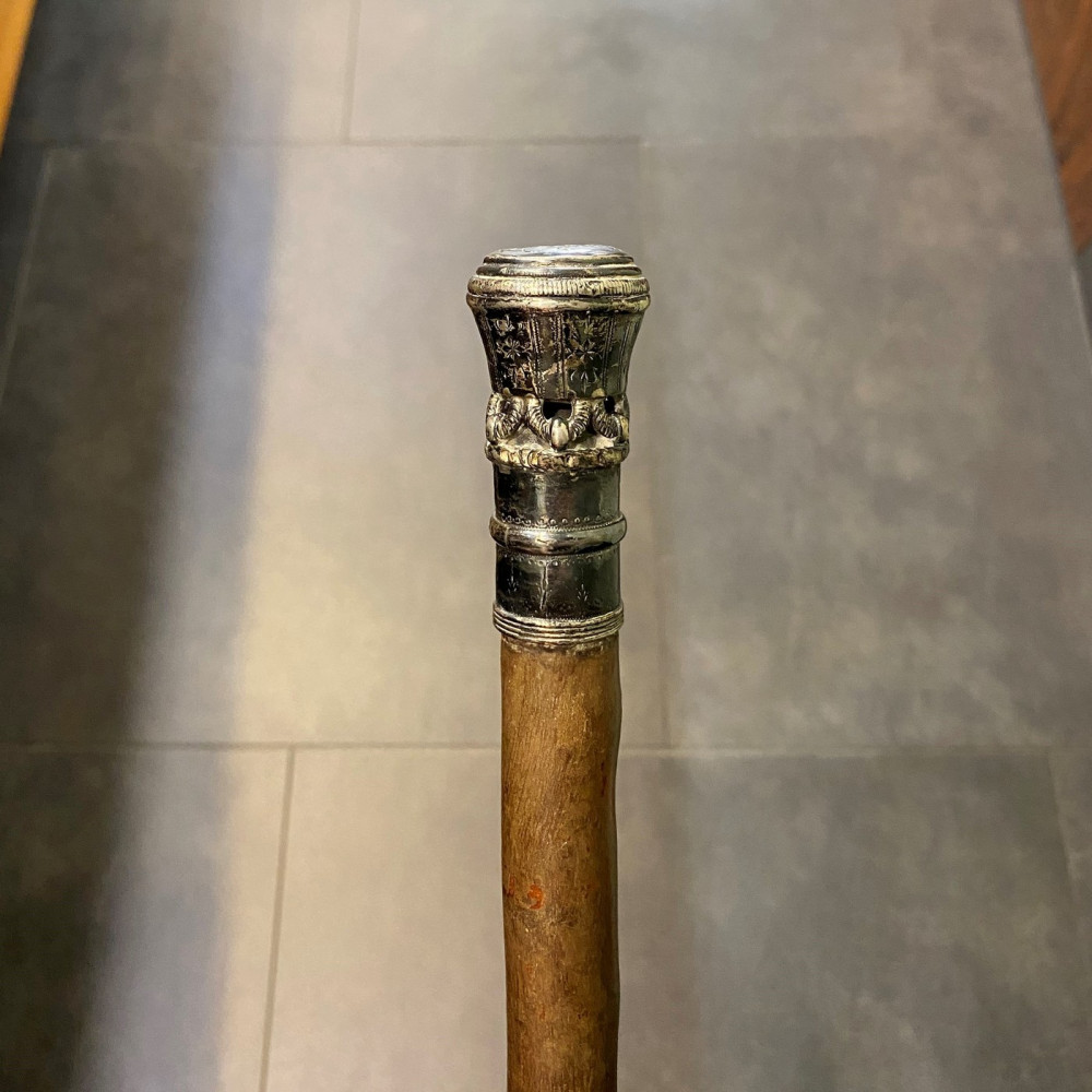 Vycházková hůl ukončená stříbrným držadlem zdobeným gravírováním a monogramem. Označeno rakousko-uherským puncem pro stříbrné zboží o ryzosti 750/1000. Délka hole je 70 cm.