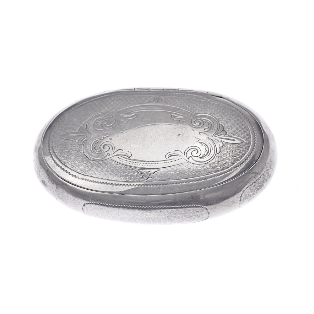 Oválná stříbrná otevírací krabička/tabatěrka vyrobená v období Rakouska-Uherska ze stříbra (o ryzosti 800/1000). Značeno rakousko-uherským puncem "Diany" s písmenem "A" (Vídeň) a mistrovskou značkou "JZ". Pro ozdobení krabičky byla použita technika gravírování a gilošování.