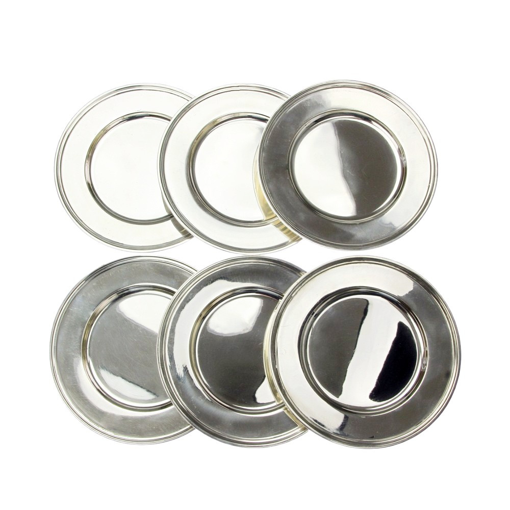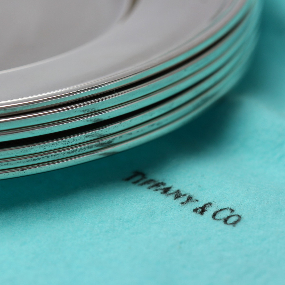 Set 6 stříbrných talířků jednoduchého designu od věhlasné klenotnické a stříbrnické značky Tiffany & Co. Vyrobeno ze stříbra o ryzosti 925/1000, jak dokládá i přiložené osvědčení z Puncovního úřadu.