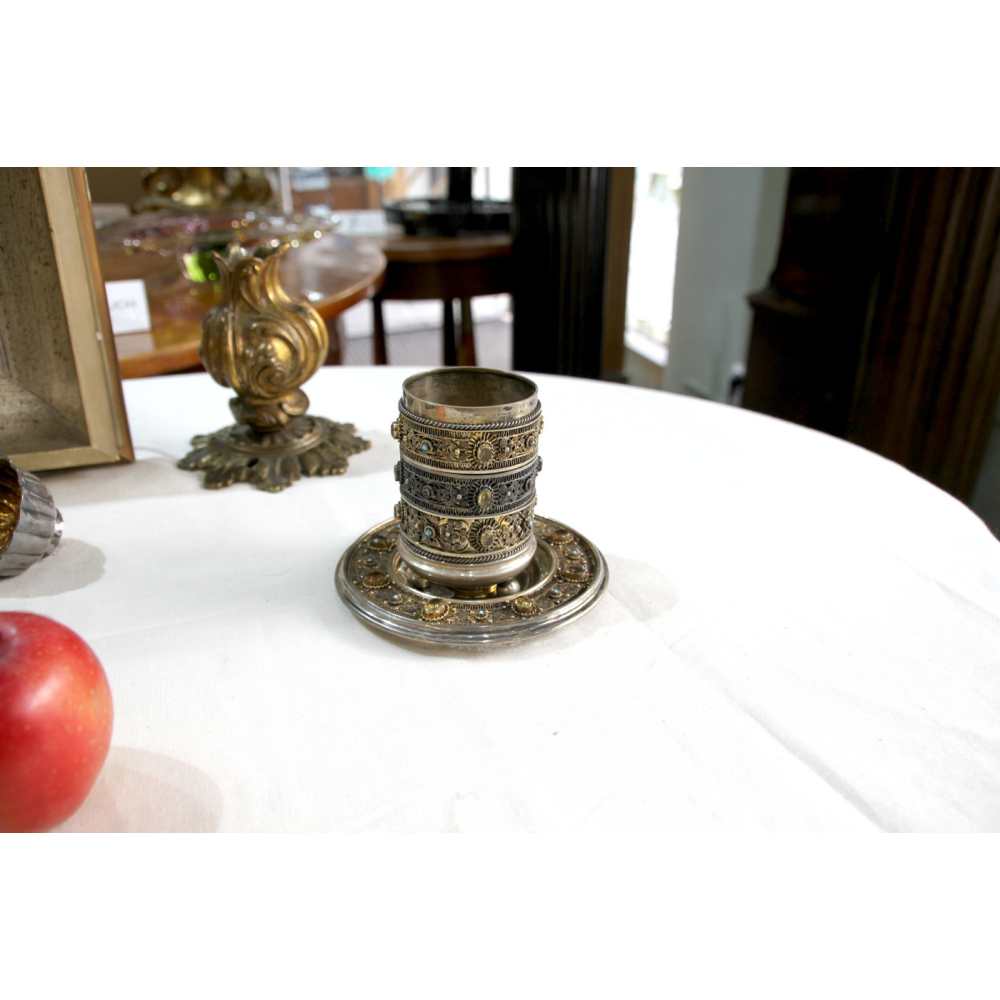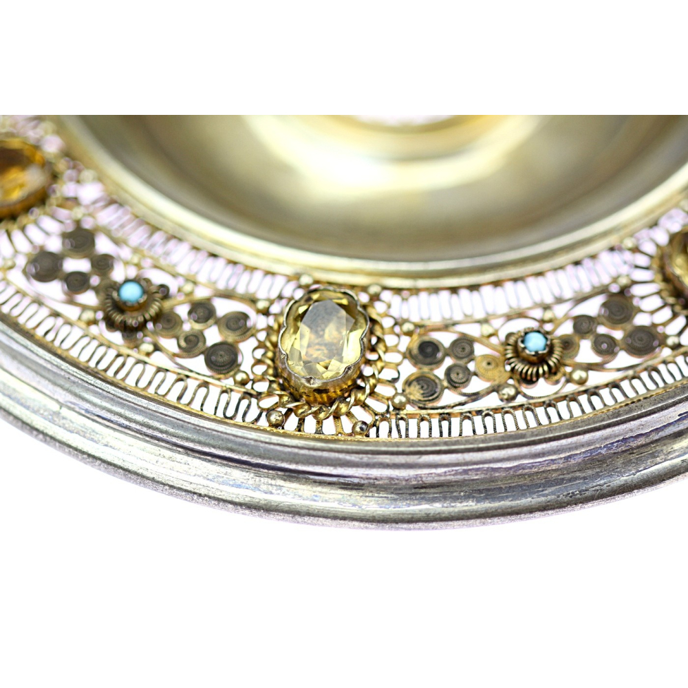 Stříbrný pohárek i talířek jsou filigránovou montáží, v níž jsou zasazené citríny, malé tyrkysy a malé rubíny. Tři filigránové pásky na poháru jsou otočné. Krásná ukázka vynikající umělecko-řemeslné práce. Vyrobeno v Německu na přelomu 19. a 20. století.
