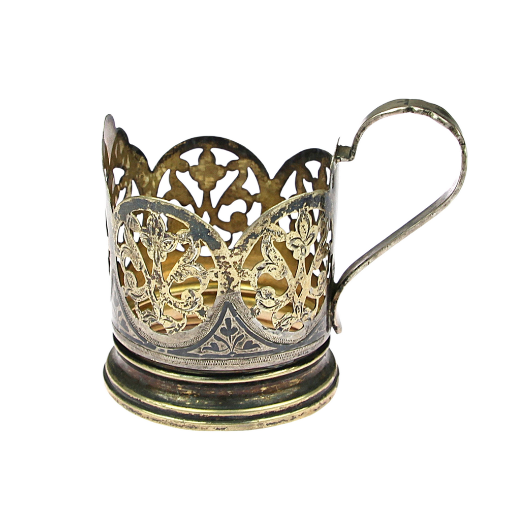 Stříbrná montáž na čajové sklenice zdobená tulou a zlacením. Vnitřní průměr je 6,5 cm. Na požádání rádi odstraníme patinu. Značeno sovětskými puncy a současným českým pro stříbro o ryzosti 835/1000.