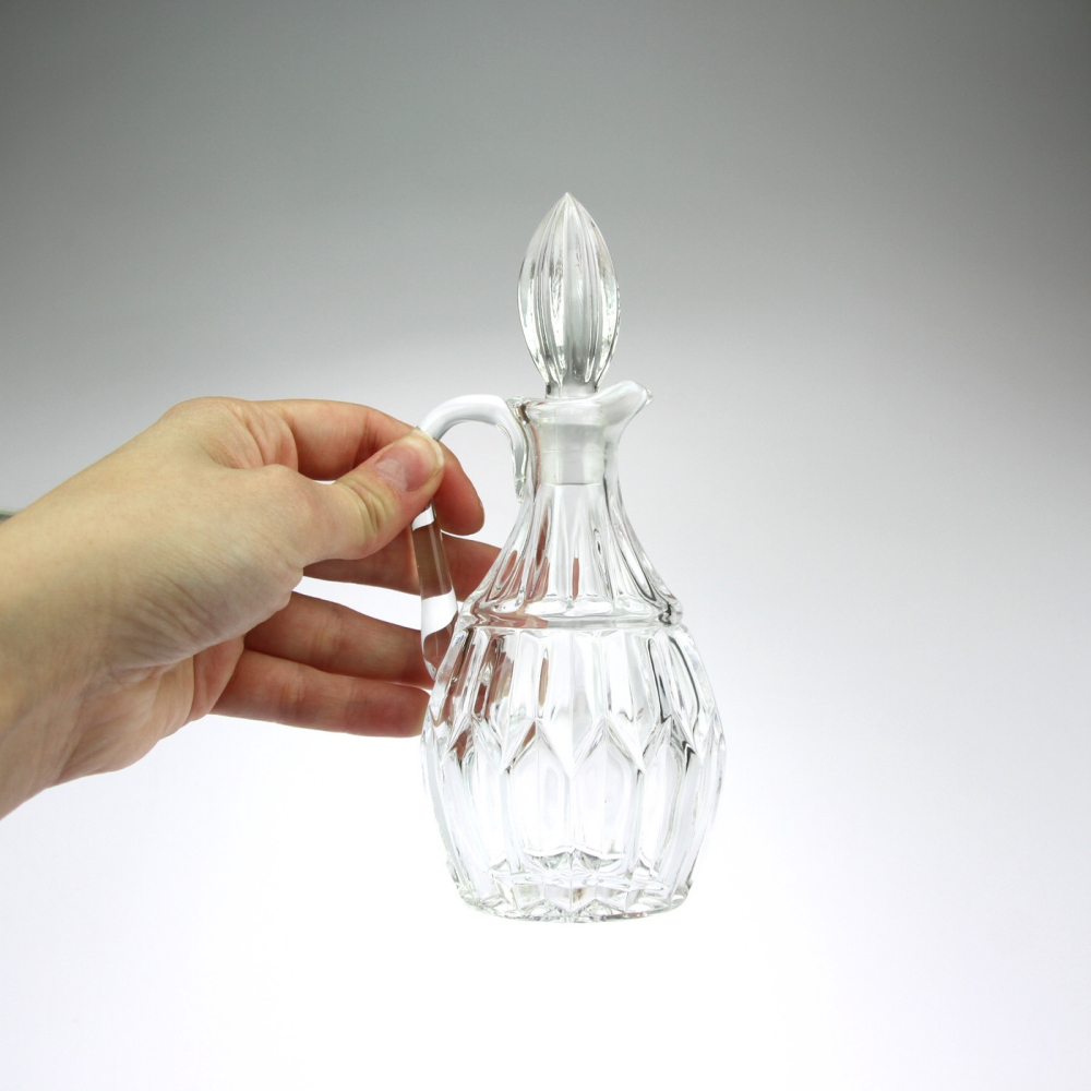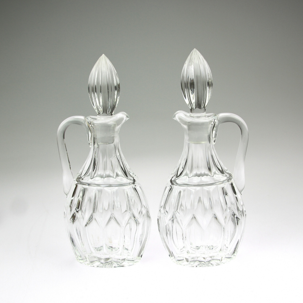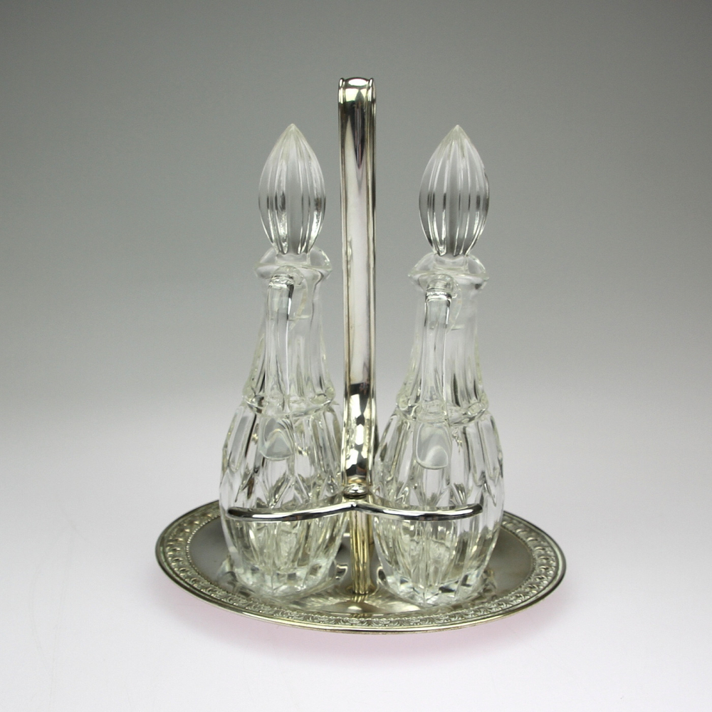 Set dvou kořenek, lahviček z broušeného skla, používané na olej a ocet. Usazeny jsou na stojánku vyrobeném ze stříbra, okraj stojánku je jemně zdobený reliéfním motivem.