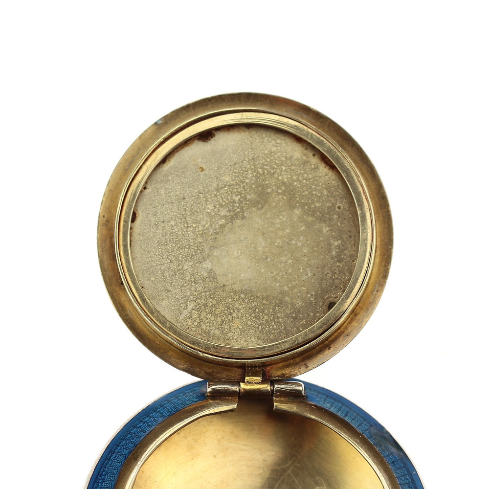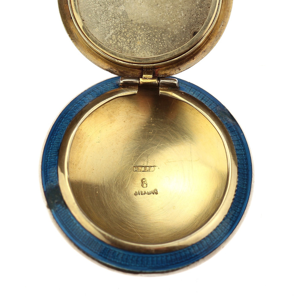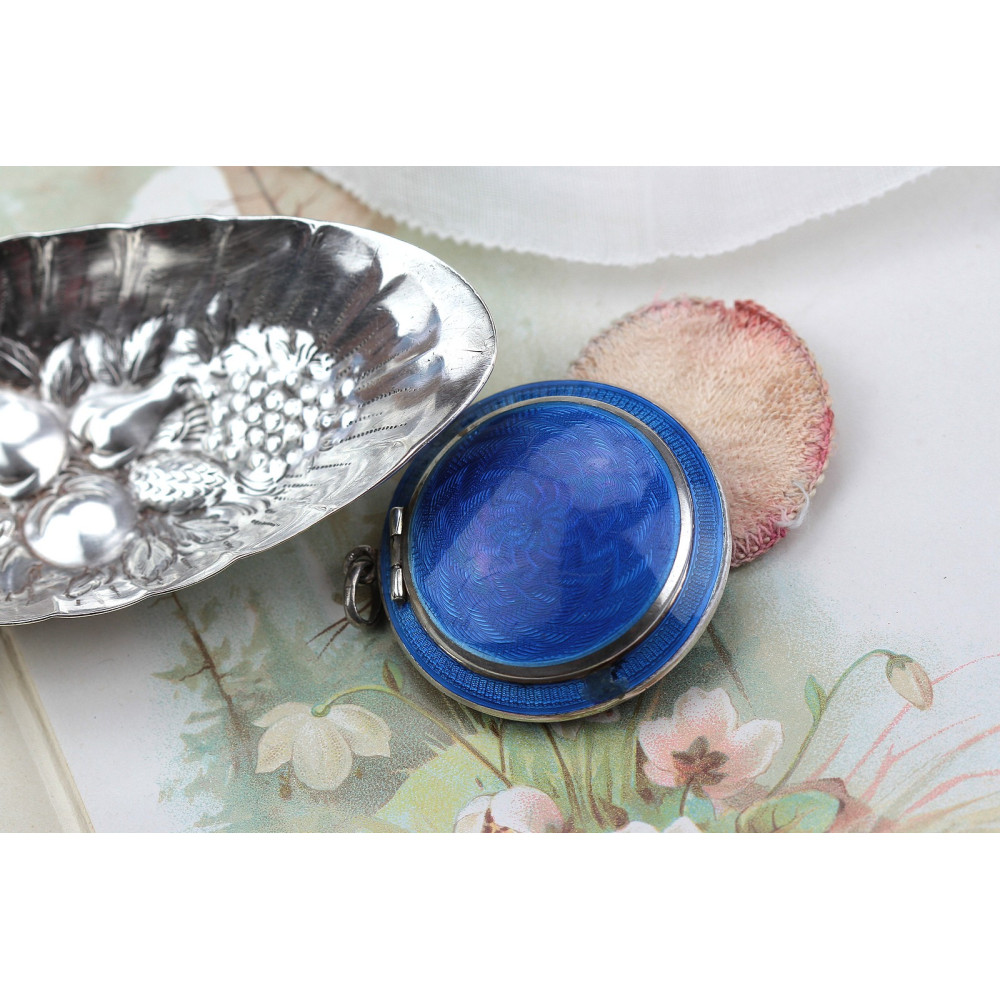 Stříbrná pudřenka zdobená z obou stran technikou gilošování, přes které je nanesen transparentní modrý smalt. Vnitřek pudřenky je částečně zlacen a nachází se zde značení "M.BROS", "8" a "STERLING". Smalt je na několika místech poškozen. Pudřenka je určená k nošení jako přívěsek.
