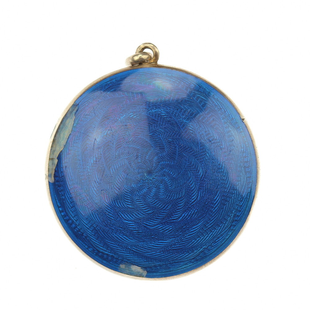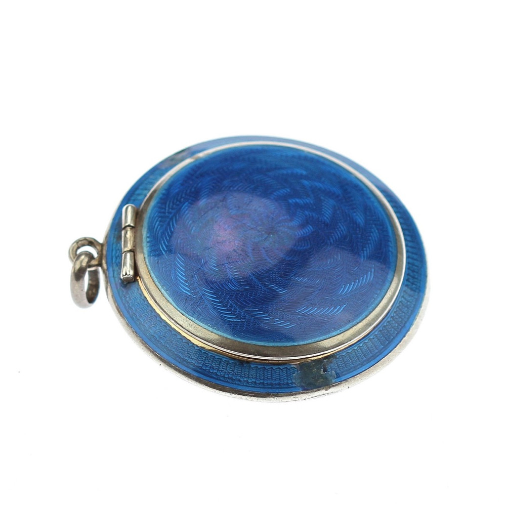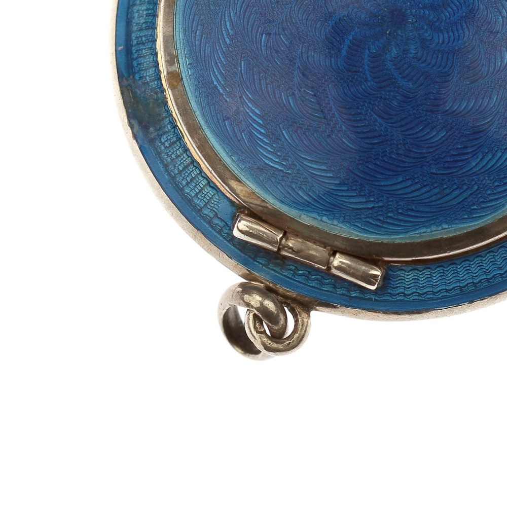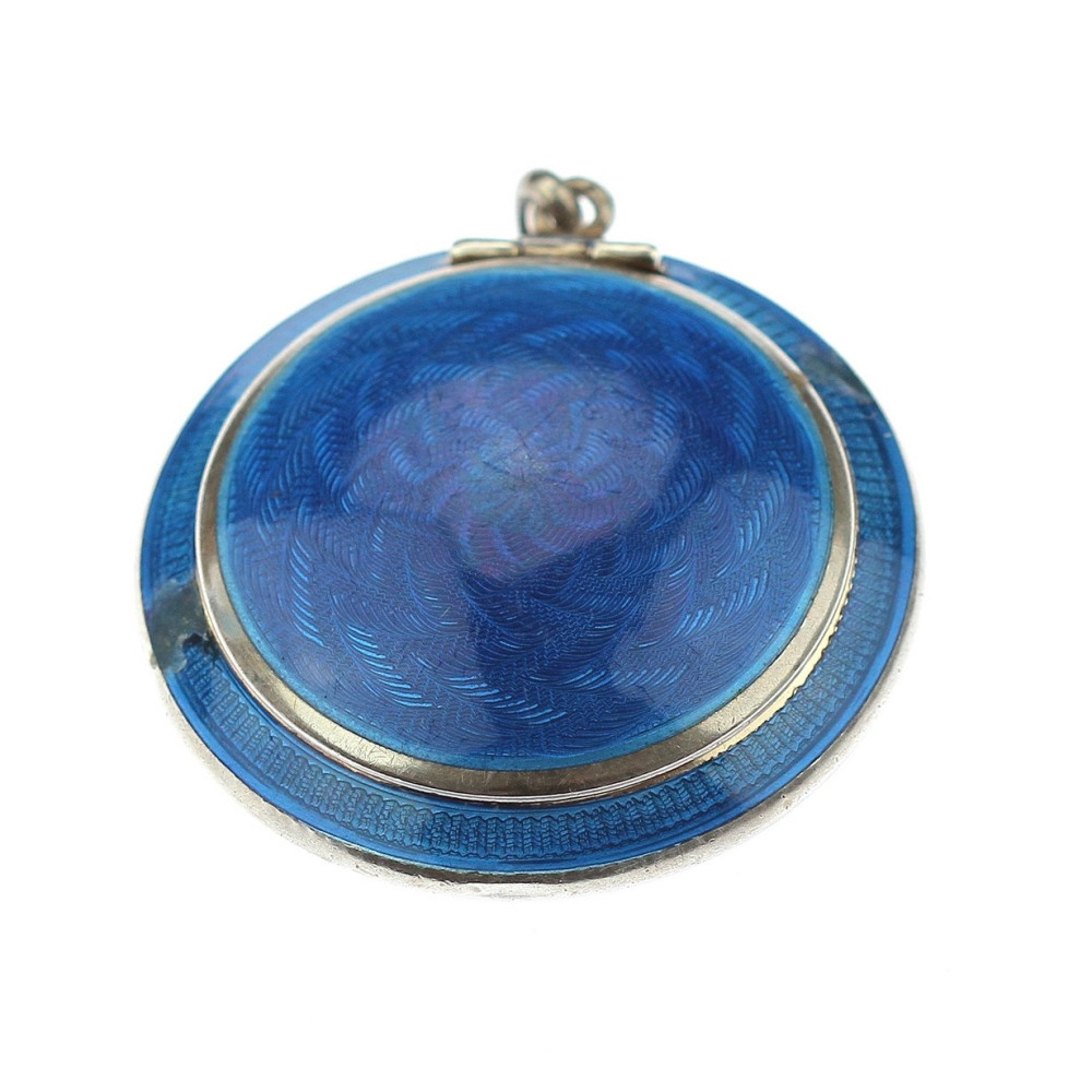 Stříbrná pudřenka zdobená z obou stran technikou gilošování, přes které je nanesen transparentní modrý smalt. Vnitřek pudřenky je částečně zlacen a nachází se zde značení "M.BROS", "8" a "STERLING". Smalt je na několika místech poškozen. Pudřenka je určená k nošení jako přívěsek.