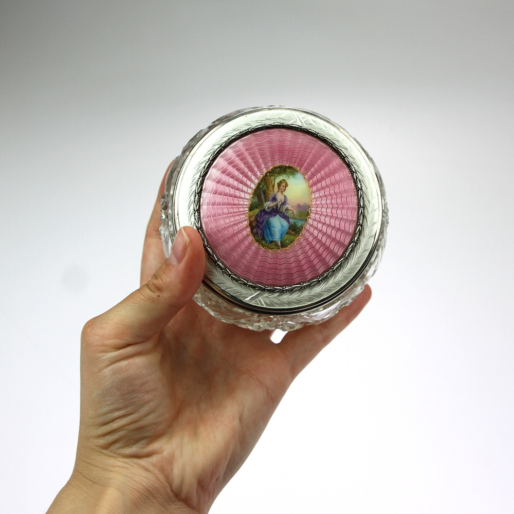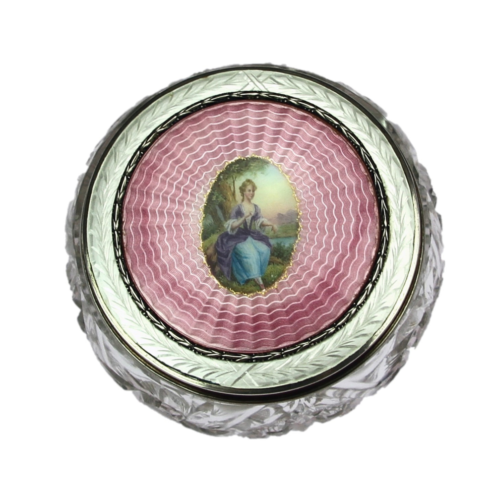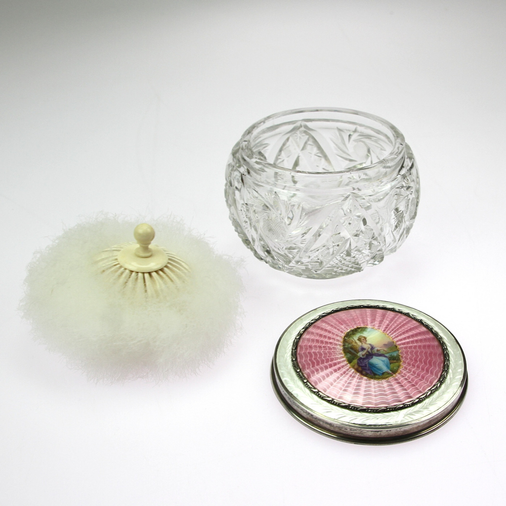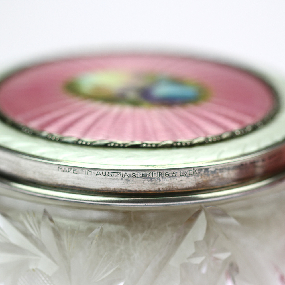 Stříbrný art deco set zrcátka a kartáče na vlasy vyrobený v Birminghamu roku 1936. Zadní strana je zdobena gilošováním a růžovým smaltem. Přední strana zrcátka i kartáče jsou označeny číslem patentu PAT. No. 247028, a dále anglickými puncovními značkami.