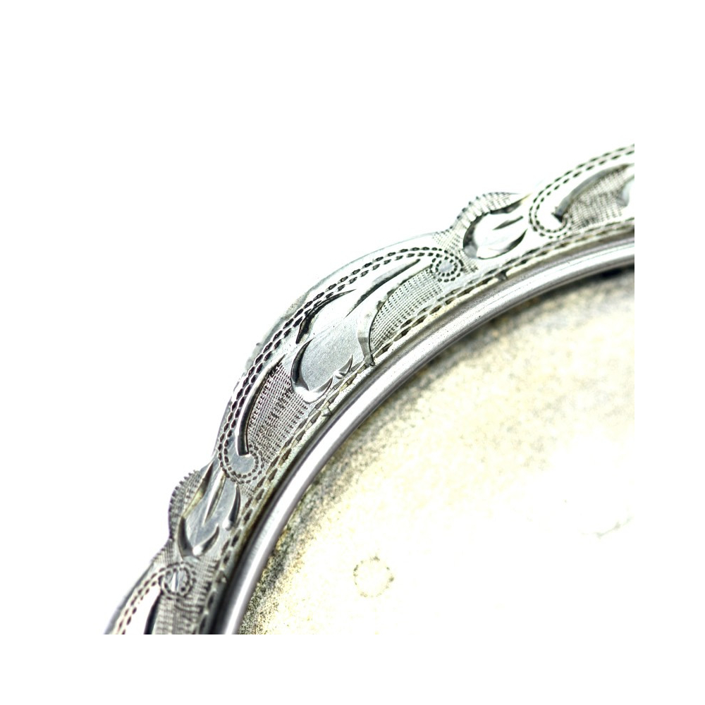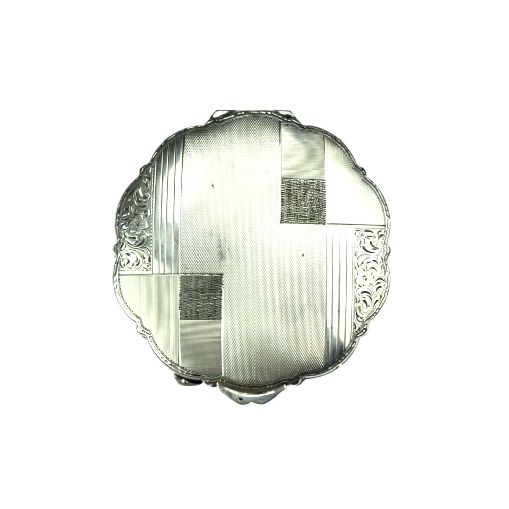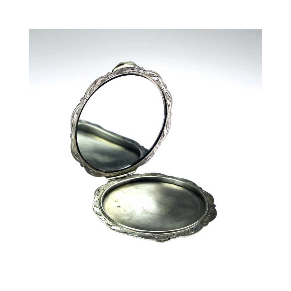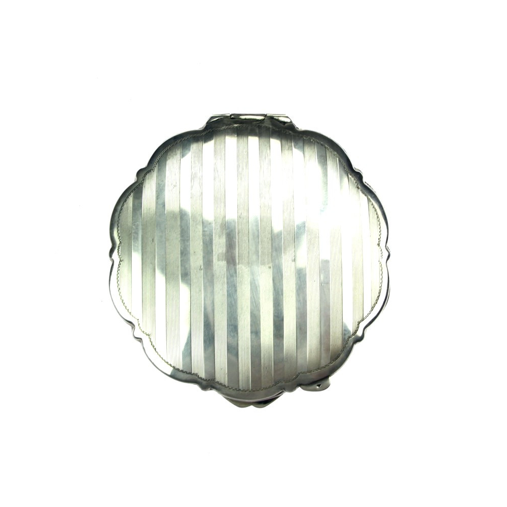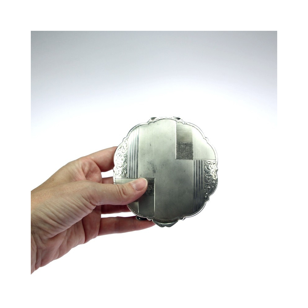 Prvorepubliková pudřenka se zrcátkem je většího rozměru, zhotovena z gilošovaného a gravírovaného stříbra Ag 800/1000.