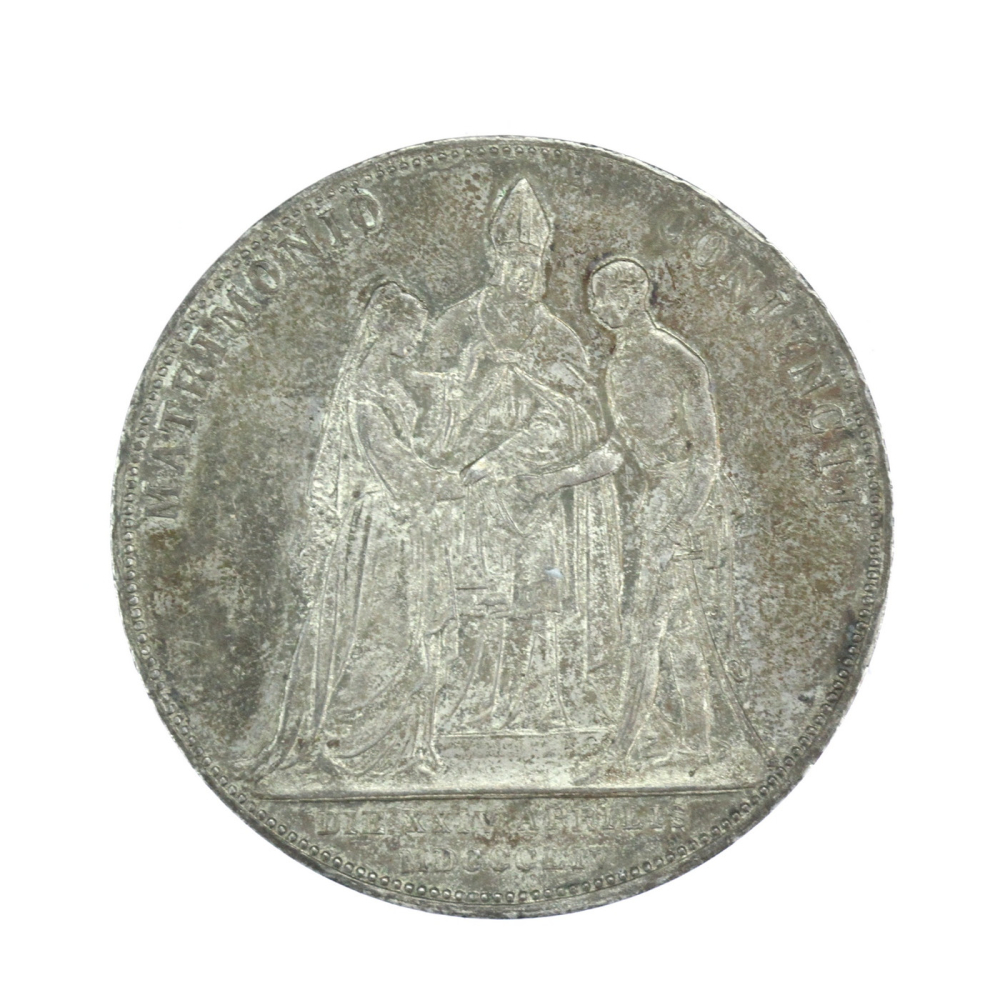 Stříbrná mince - dvougulden, též označovaný jako dvouzlatník, vyražený v roce 1854 k příležitosti svatby rakouského císaře Františka Josefa I. a Alžběty Bavorské (Sisi).