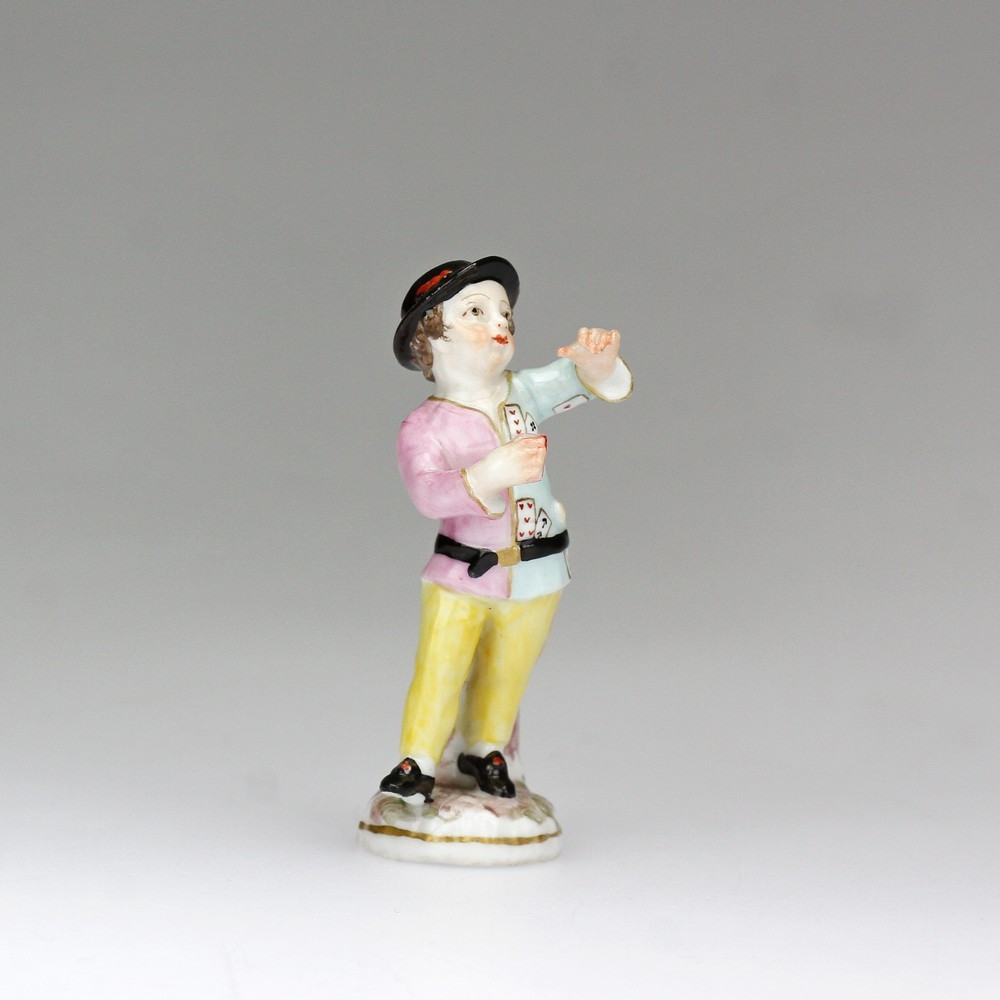 Porcelánová soška chlapce, který skrývá v ruce hrací kartu; motiv karet má i na oděvu, je tedy možné, že se jedná o alegorii hry v karty. Vyrobeno v pařížské porcelánce Edmé Samson v období 40. - 60. let 20. století. Práce napodobuje starší míšeňskou produkci z 18. století.
