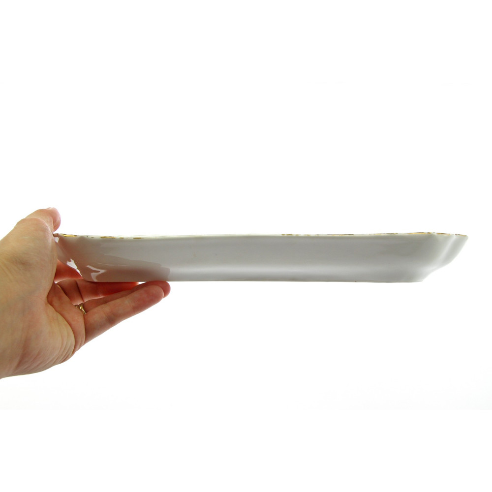 Menší porcelánový nástolec zdobený květinovým dekorem a zlatou linkou. Na dně misky je patrná "vada" z výroby, jinak je bez oťuků.