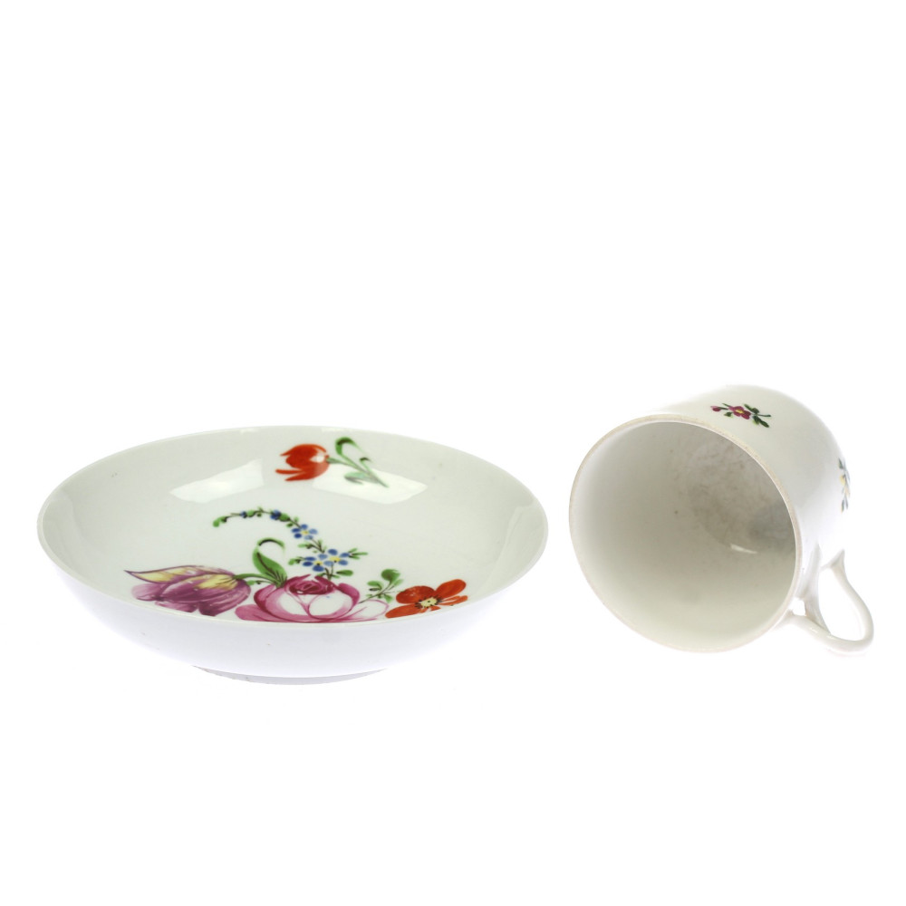 Porcelánový šálek s podšálkem, oba kusy zdobí květinová malba. Šálek byl vyroben mezi lety 1839-1859 ve Vídeňské manufaktuře, podglazurní značení na podšálku odkazuje na výrobu mezi lety 1777-1785 v německém Ilmenau.