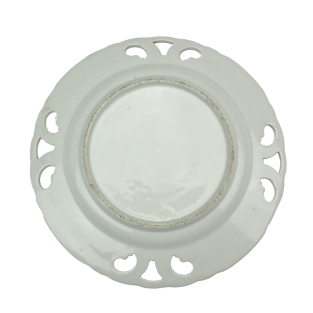 Dekorační talíř vyrobený z porcelánu, zdobený malbou květin, zlatou linkou a prolamováním. Podglazurní vtlačené značení "CF" odkazuje na Christiana Fischera, porcelánku Pirkenhammer (Březová), období mezi lety 1846-1853.