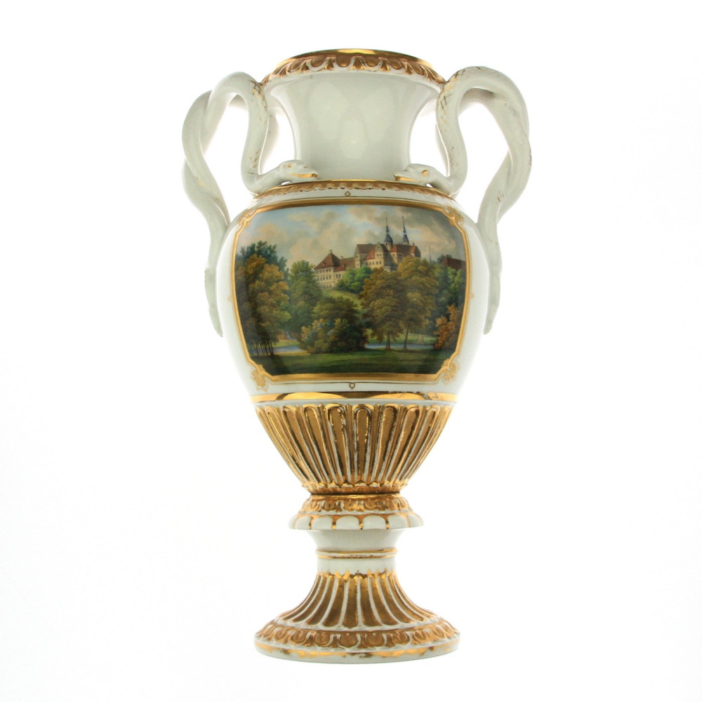 Tato váza je vyrobena slavnou porcelánkou Míšeň v Německu. Jedná se o model E 153 - značení, které se používalo od roku 1851. Na přední částí vázy je vyobrazen zámek Zschepplin (Sasko) a zezadu datum (výročí) 30. září 1838 - 30. září 1863. Vázu zdobí mnoho propracovaných detailů včetně zlacení a uch ve tvaru proplétajících se hadů.