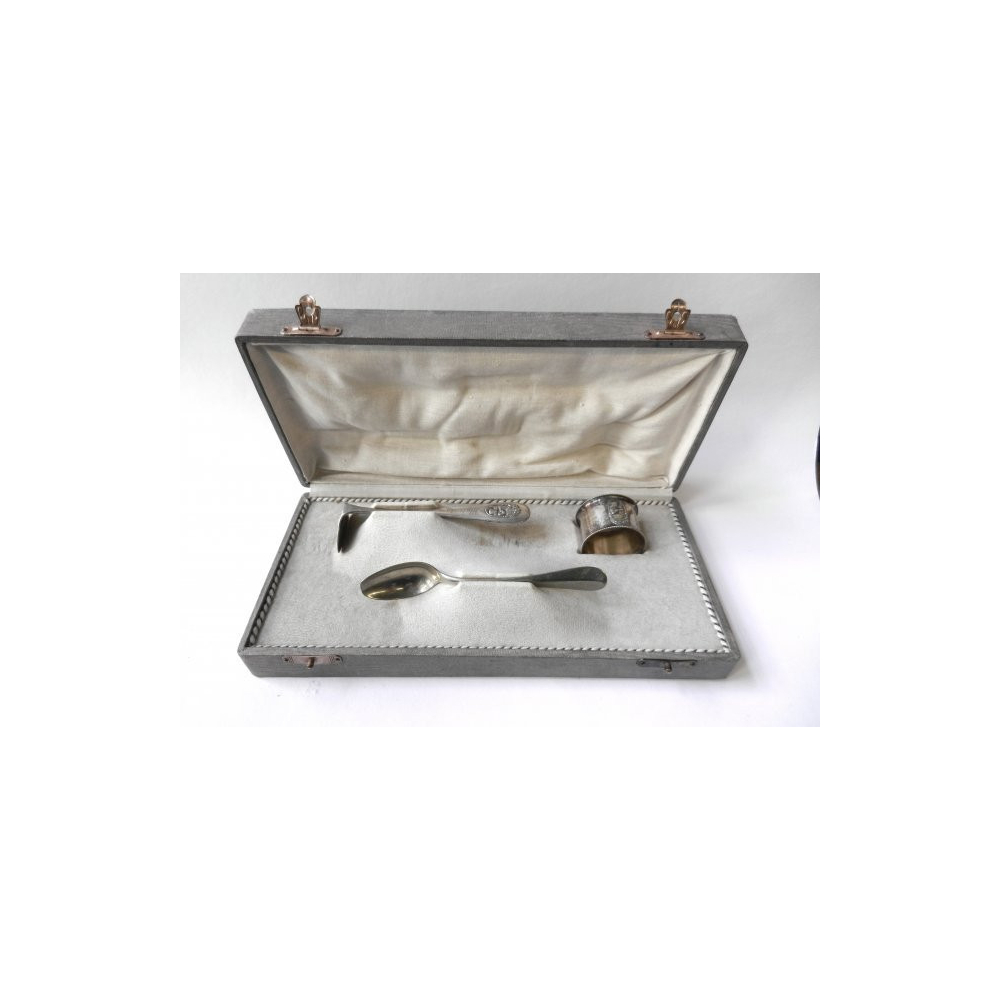 Dětská alpaková sada tvořená lžičkou, hrabílkem a kroužkem na ubrousky sloužila pravděpodobně jako dárek ke křtinám.