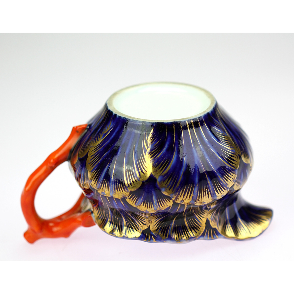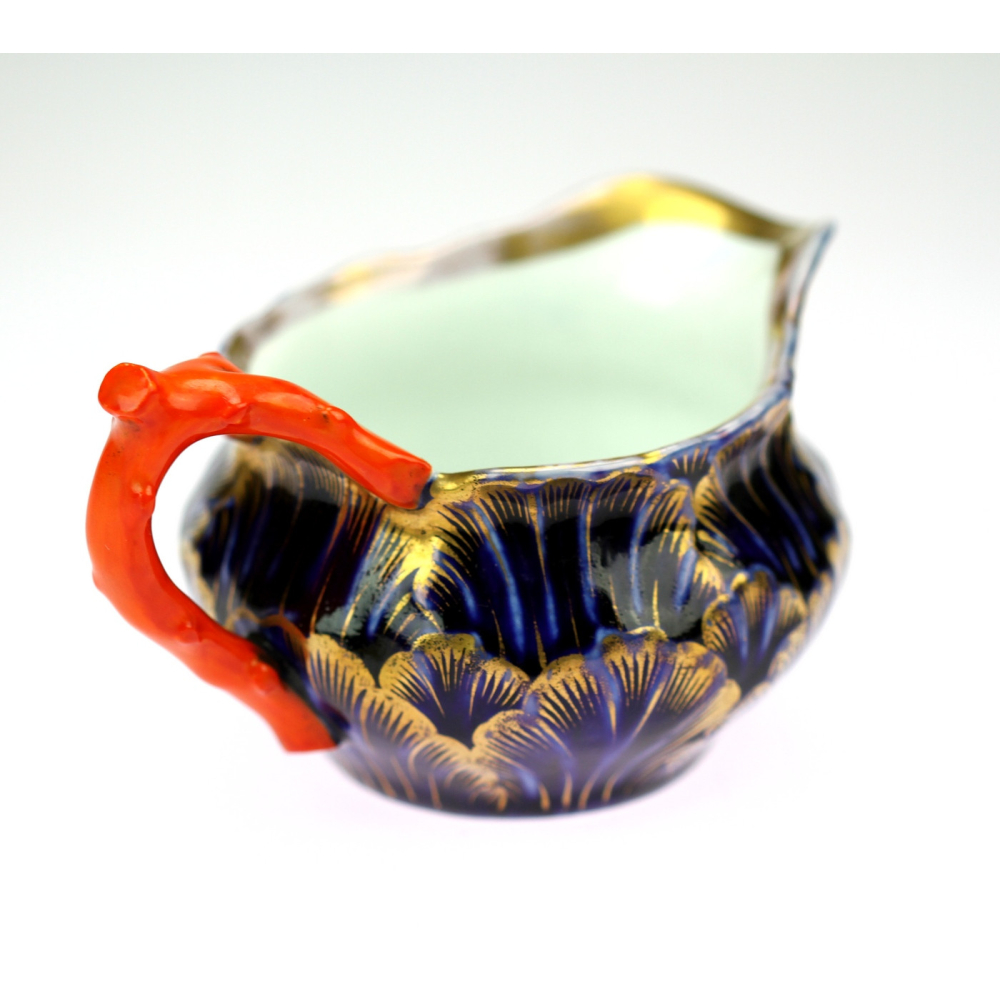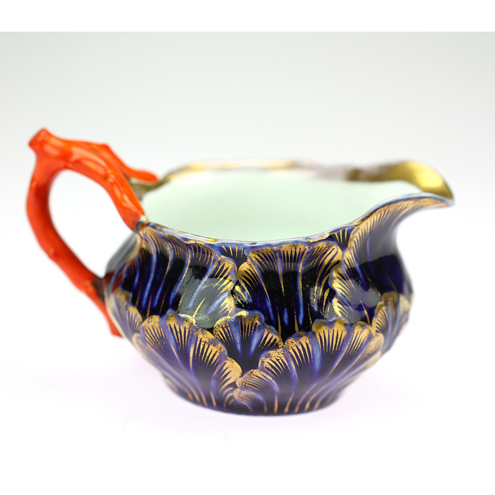 Porcelánová mléčenka vyrobená okolo roku 1850 v Karlových Varech. Předmět zdobí krásný rostlinný motiv malovaný kobaltem a zlatem, ouško tvarované jako větvička (nebo korál) odkazuje na východoasijskou tradici.