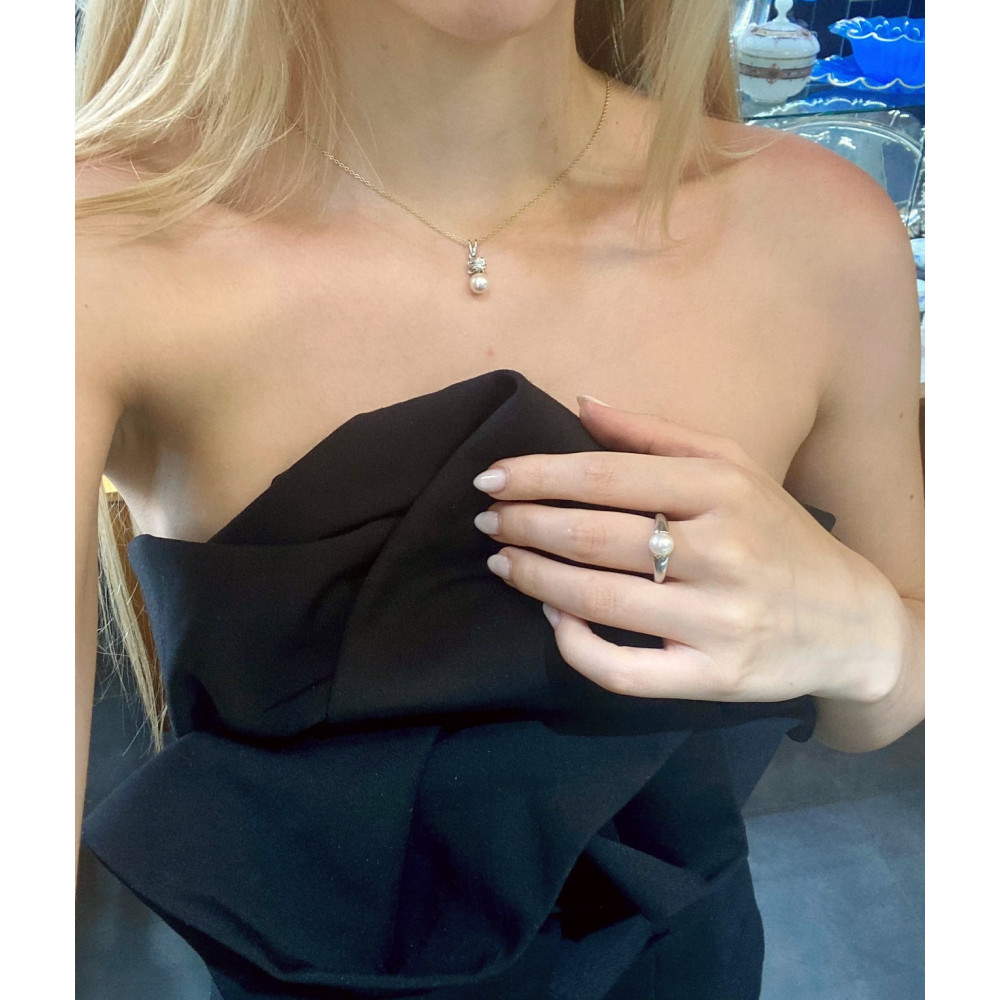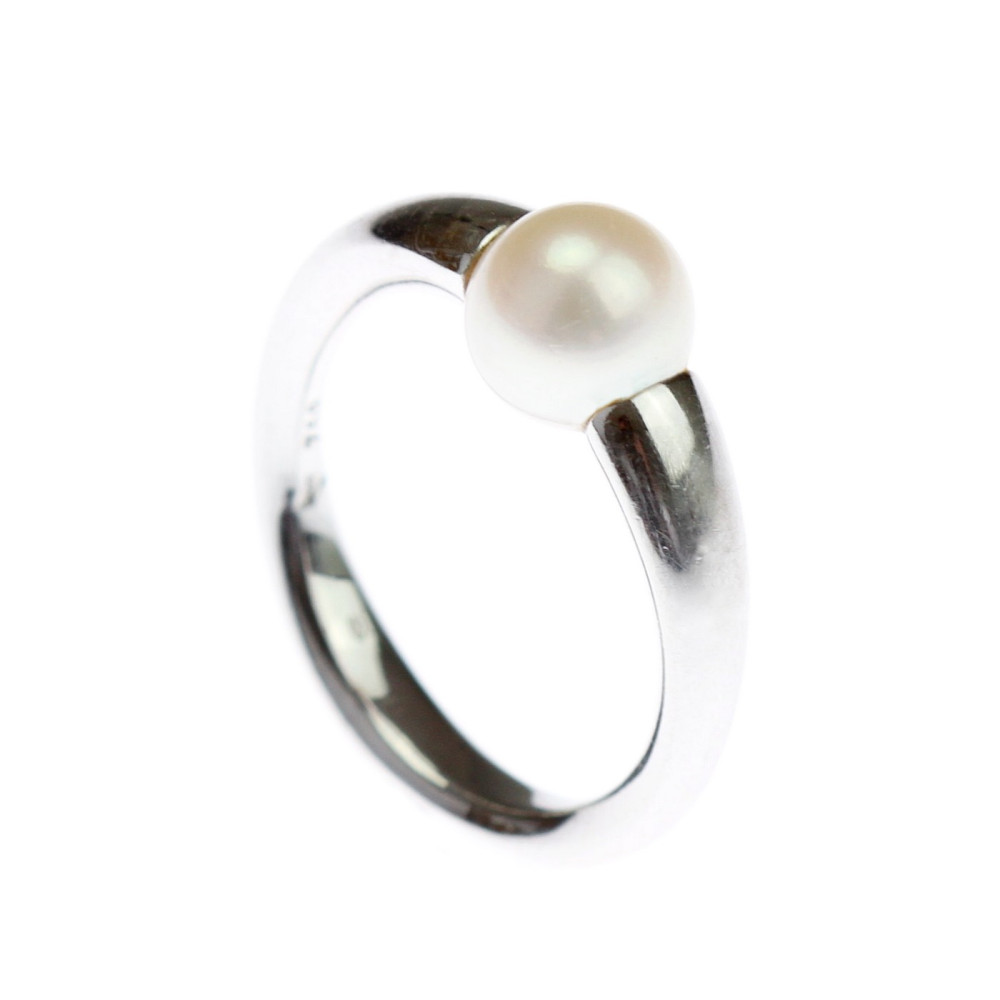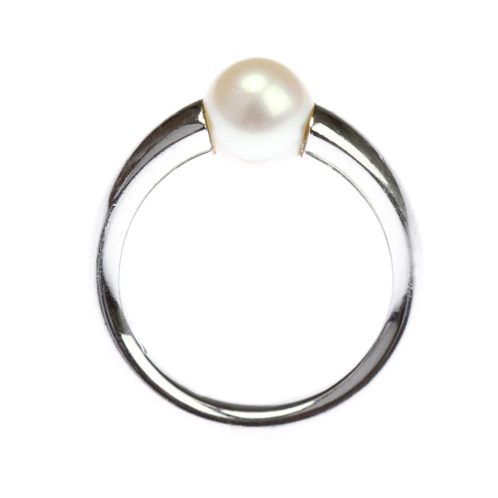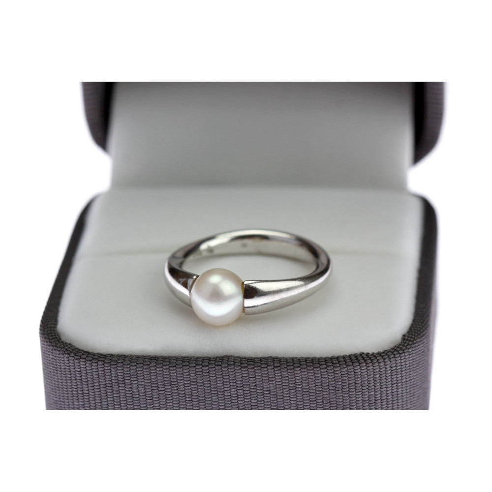 Moderní prstýnek z bílého 18karátového zlata osazený přírodní kultivovanou perlou o průměru 7,4 mm.