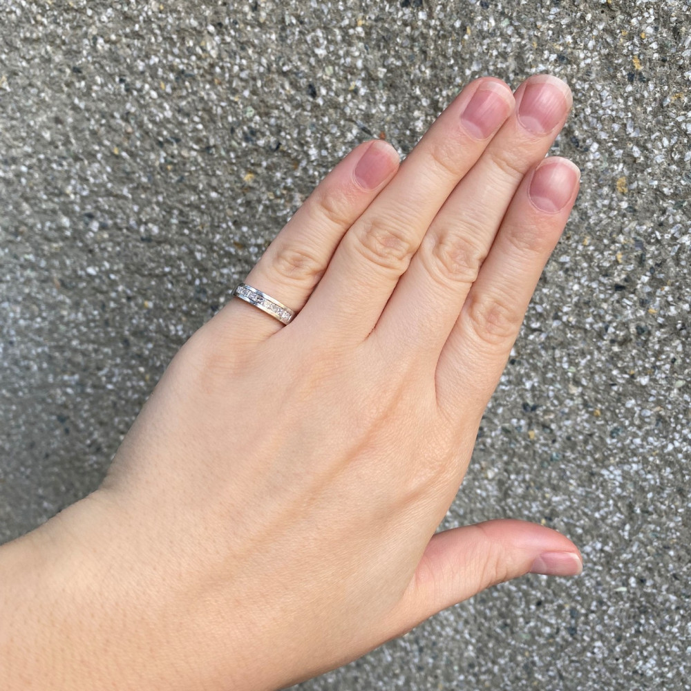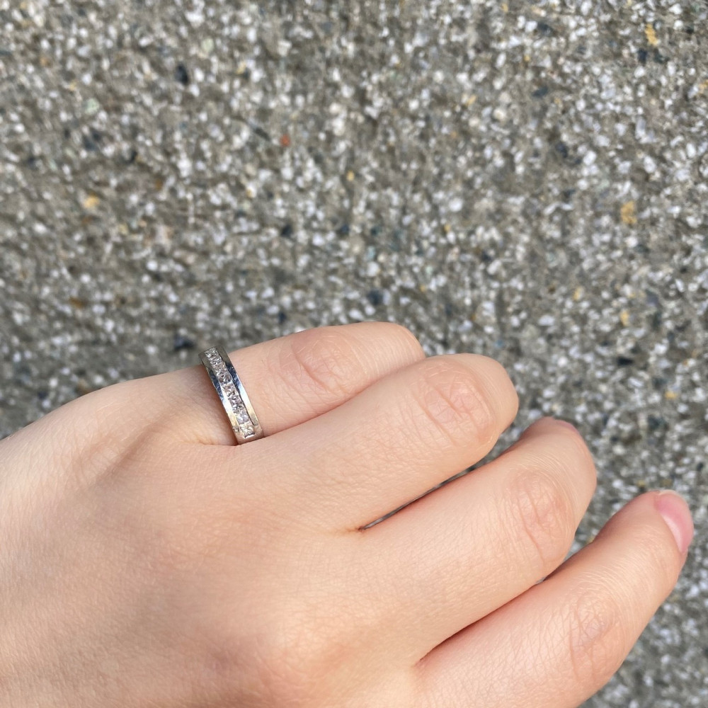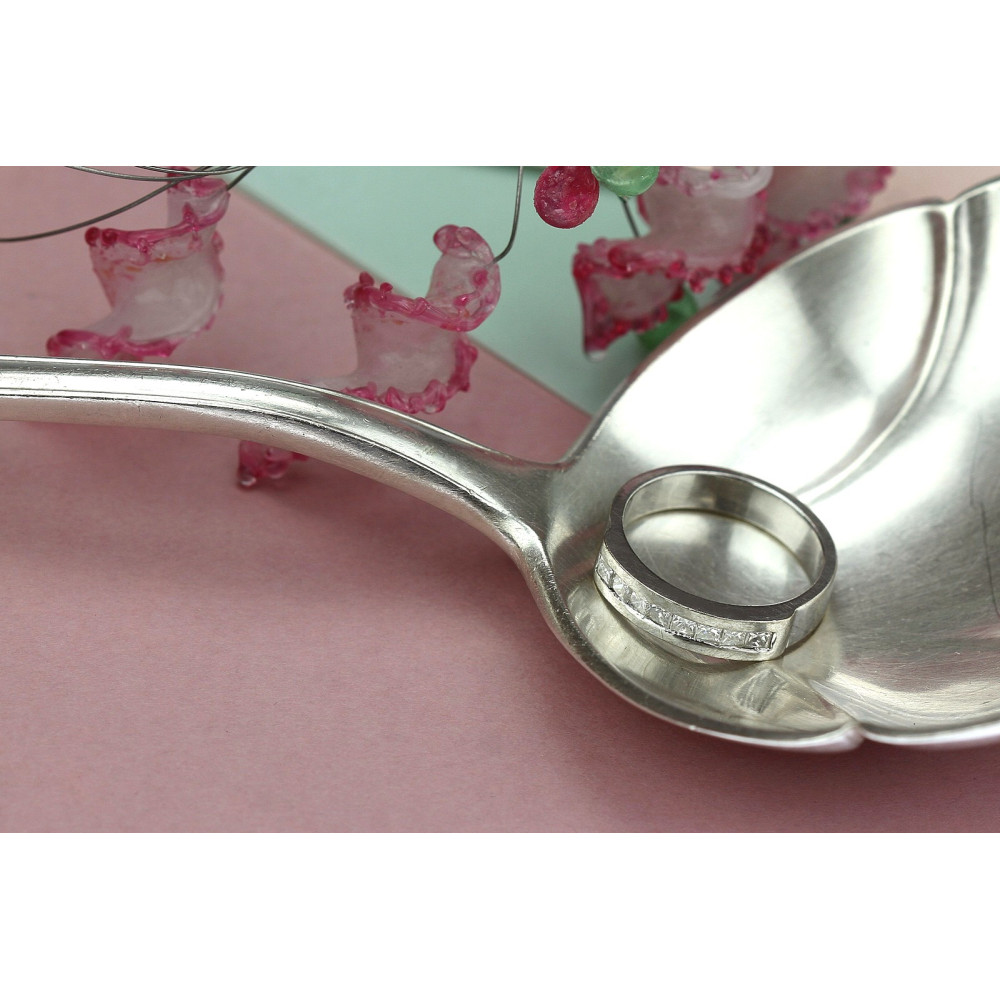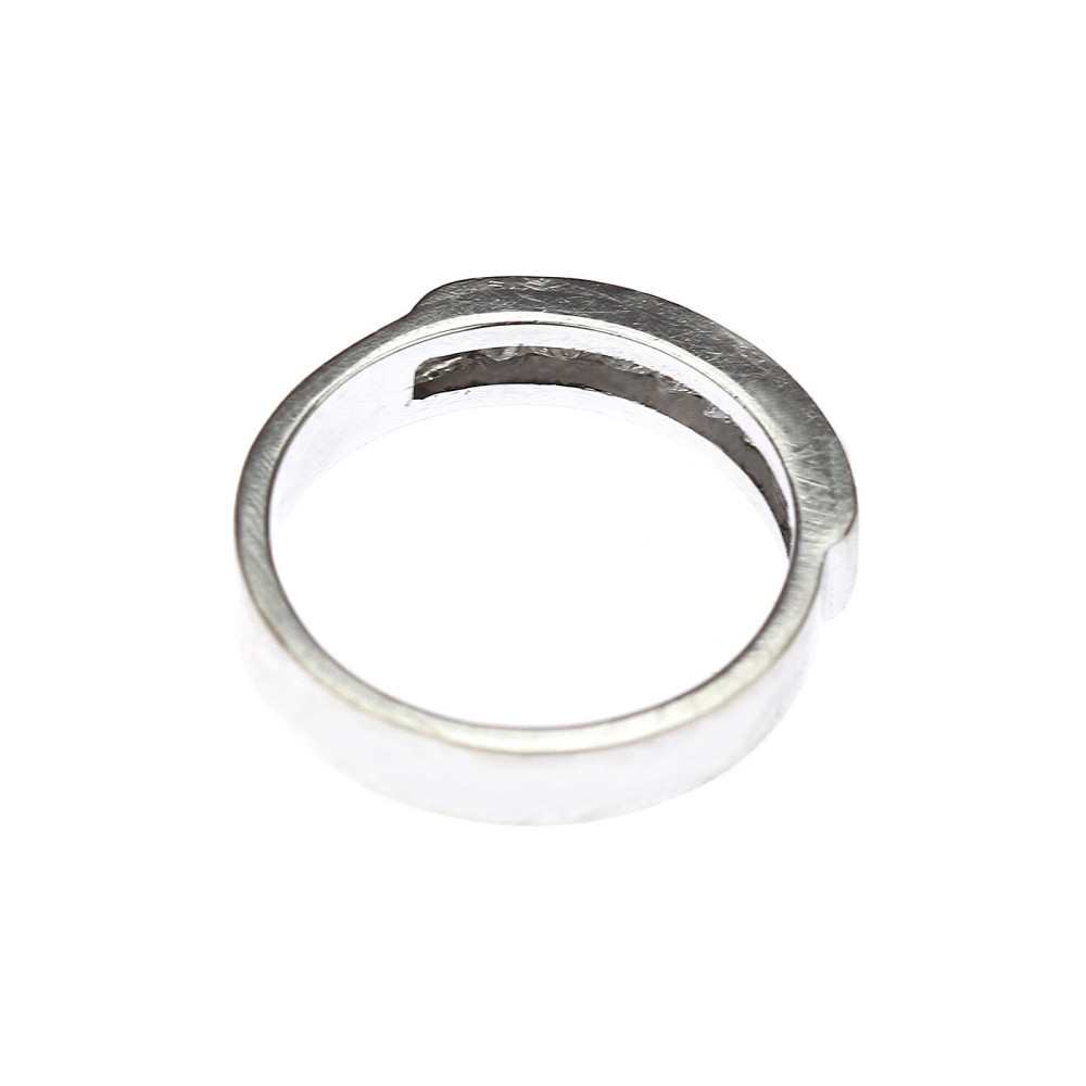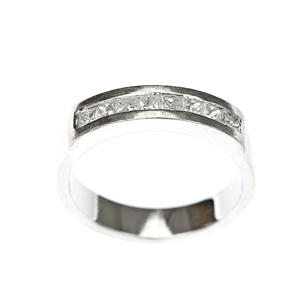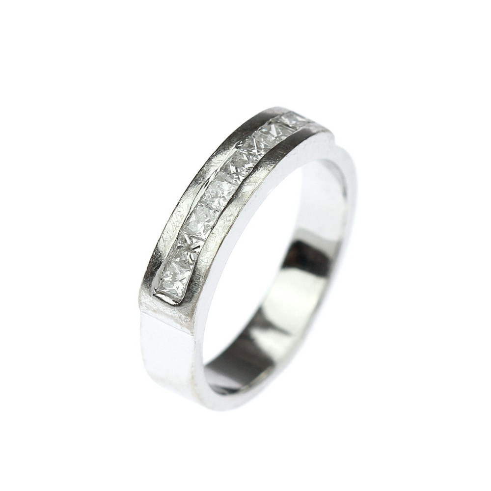 Moderní prstýnek vyrobený z bílého 14karátového zlata osazený 8 přírodními diamanty čtvercového brusu (tzv. "princess cut"), každý o váze 0,05 ct, barvě F a čistotě SI. Celková váha diamantů činí 0,40 ct. Označen současným českým platným puncem "labuť".