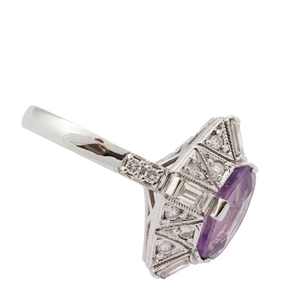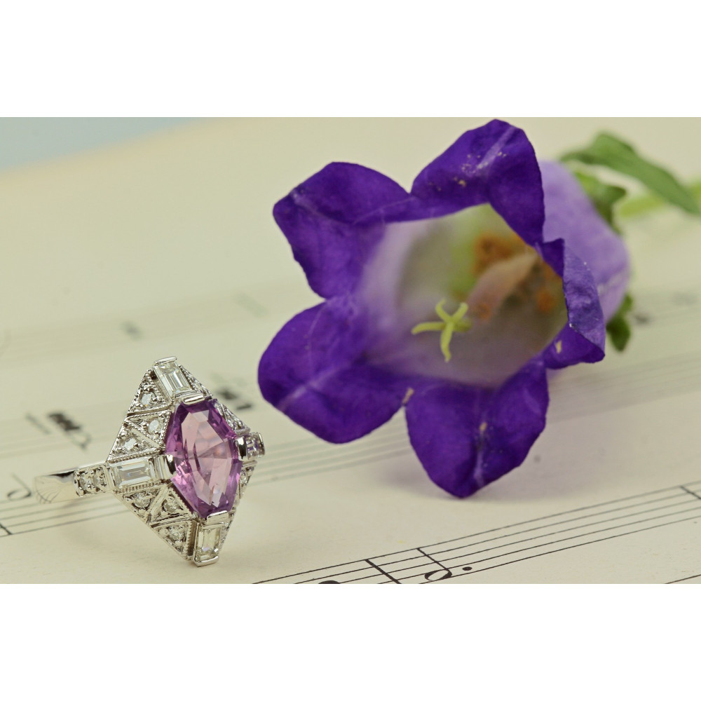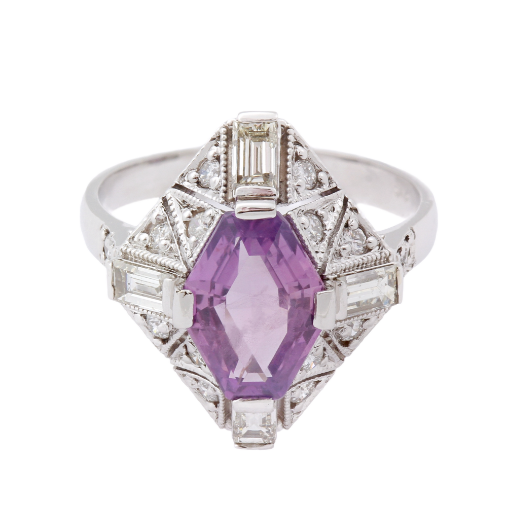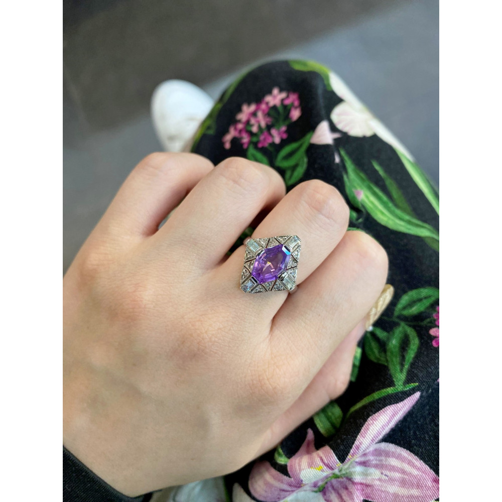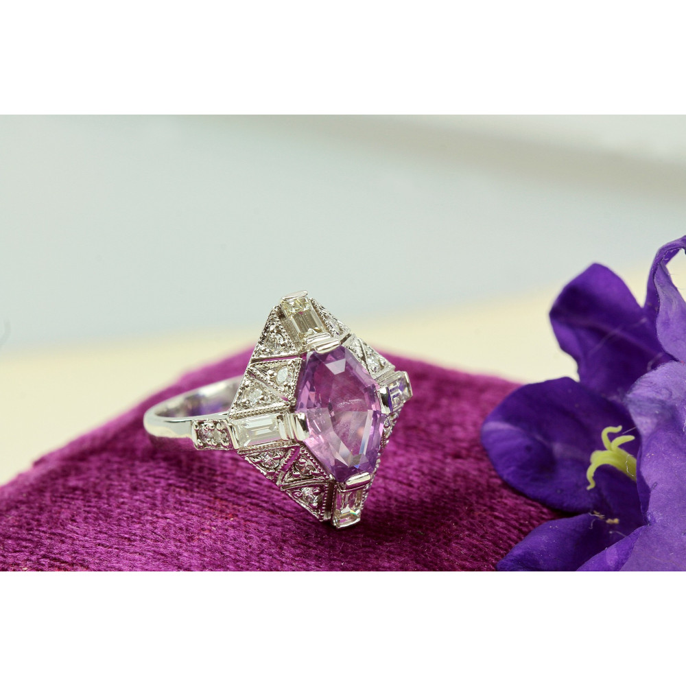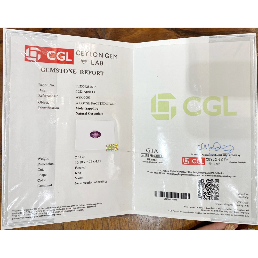 Prsten vyrobený z bílého 14karátového zlata je osazen přírodním cejlonským safírem barvy "violet" (fialovorůžová) o váze 2,51 ct, který nebyl upravován zahříváním. Kámen má certifikaci CGL (Ceylon Gem Lab).