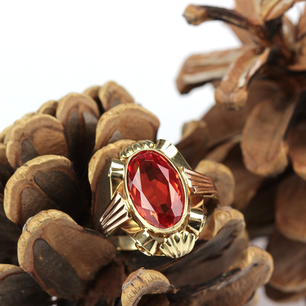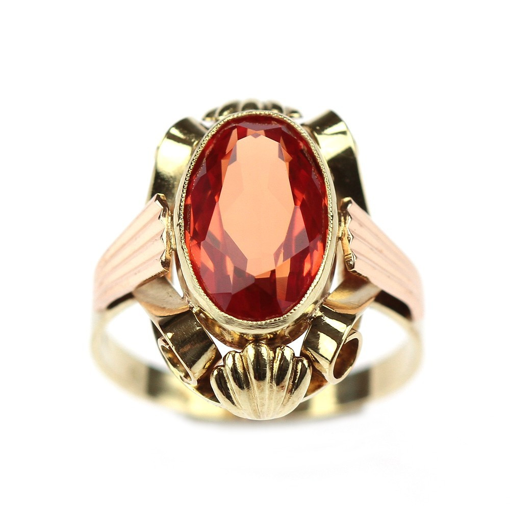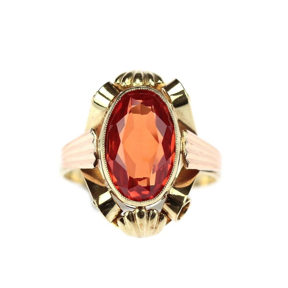 Prsten ze žlutého a růžového 14karátového zlata s oranžovým syntetickým safírem je označen puncem "čejka" a ryzostním číslem.