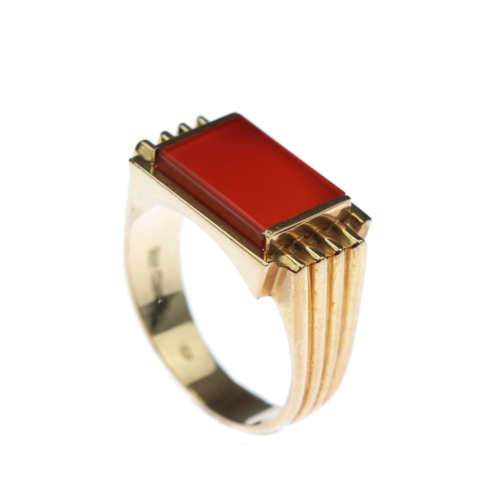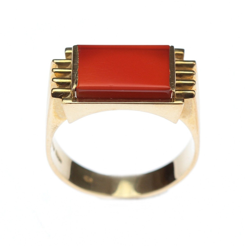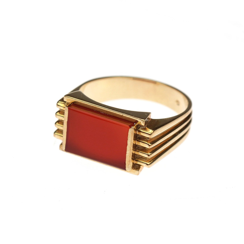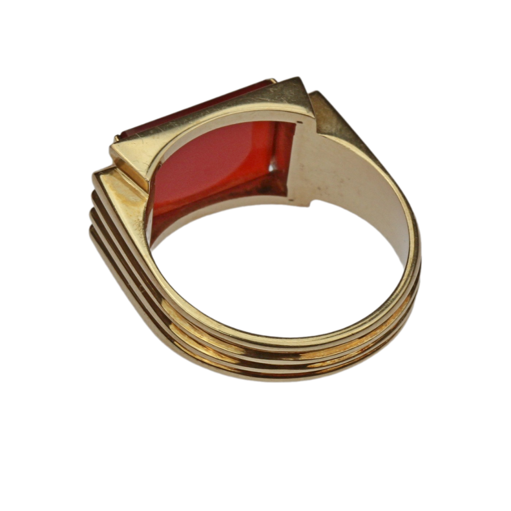 Prvorepublikový pánský prsten ze žlutého 14karátového zlata s destičkou z přírodního karneolu. Značeno prvorepublikovým puncem "lvíček", který byl používaný v letech 1929-1949 v Československu, ryzostním číslem a mistrovskou značkou "BF".