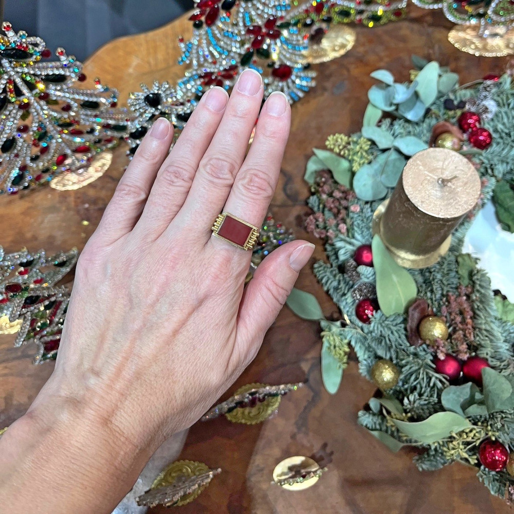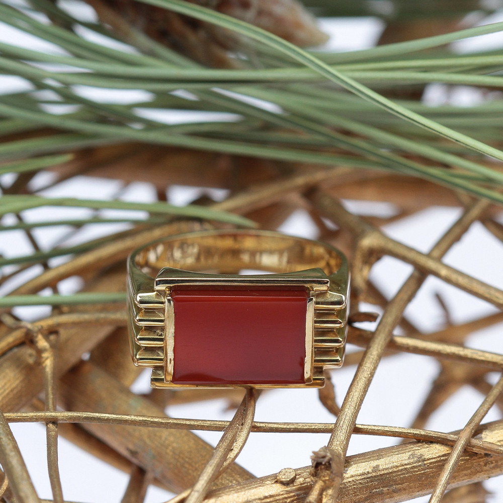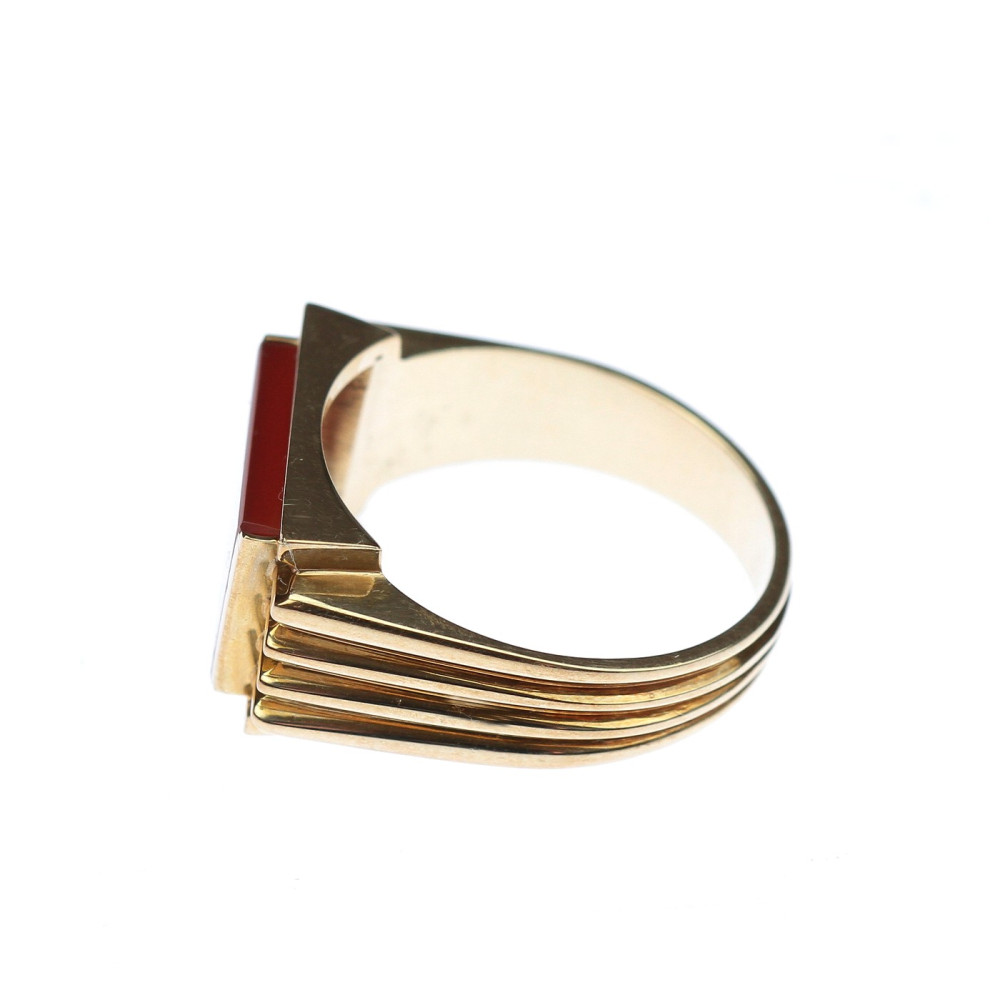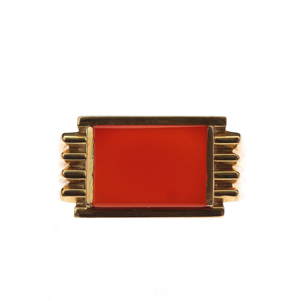 Prvorepublikový pánský prsten ze žlutého 14karátového zlata s destičkou z přírodního karneolu. Značeno prvorepublikovým puncem "lvíček", který byl používaný v letech 1929-1949 v Československu, ryzostním číslem a mistrovskou značkou "BF".