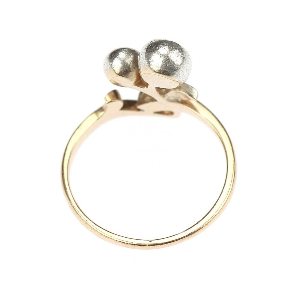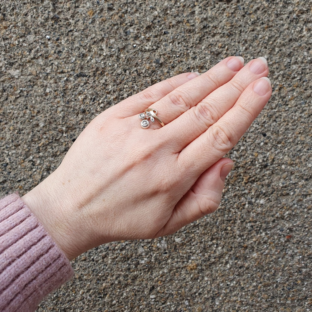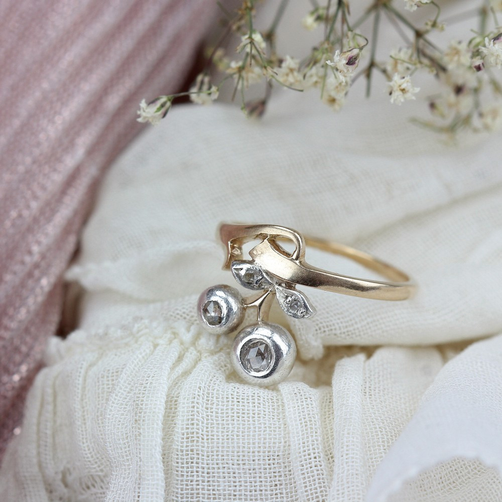 Secesní prstýnek z počátku 20. století vyrobený z růžového 14karátového zlata (Au 580/1000) s přírodními diamanty routového brusu, které jsou zasazené ve stříbře. Značeno pražským rakousko-uherským puncem pro 14karátové zlato.