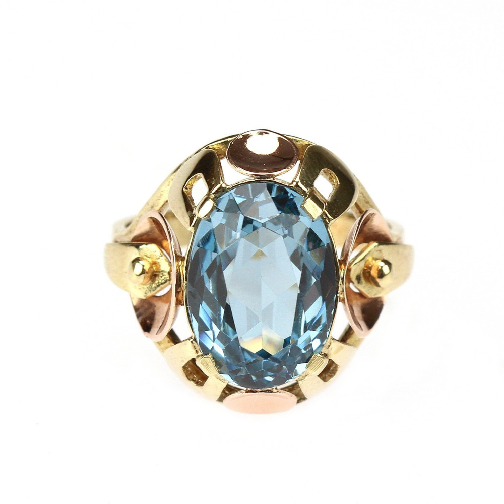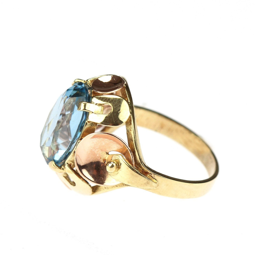 Prsten ze žlutého a růžového 14karátového zlata s oranžovým syntetickým safírem je označen puncem "čejka" a ryzostním číslem.