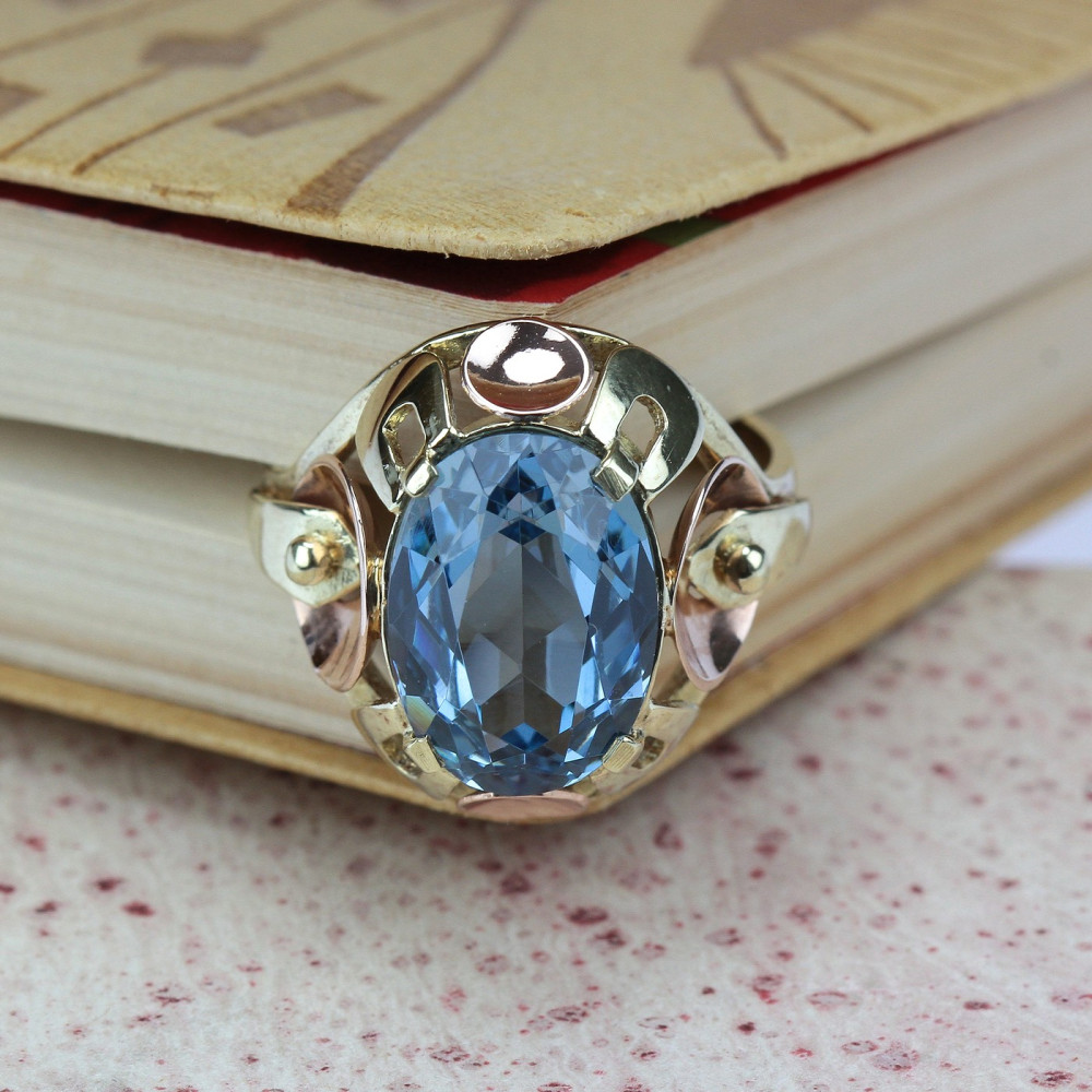 Prsten s výraznou hlavou ze žlutého a částečně i z růžového 14karátového zlata. V centru korunky dominuje broušený syntetický spinel modré barvy, kolem něhož je vytvořen velmi dekorativně pojatý rámeček. Šperk je oražen výrobní značkou „SAF“ (Safina), ryzostním číslem 585 a puncem „čejka“, používaným v letech 1949–1992.