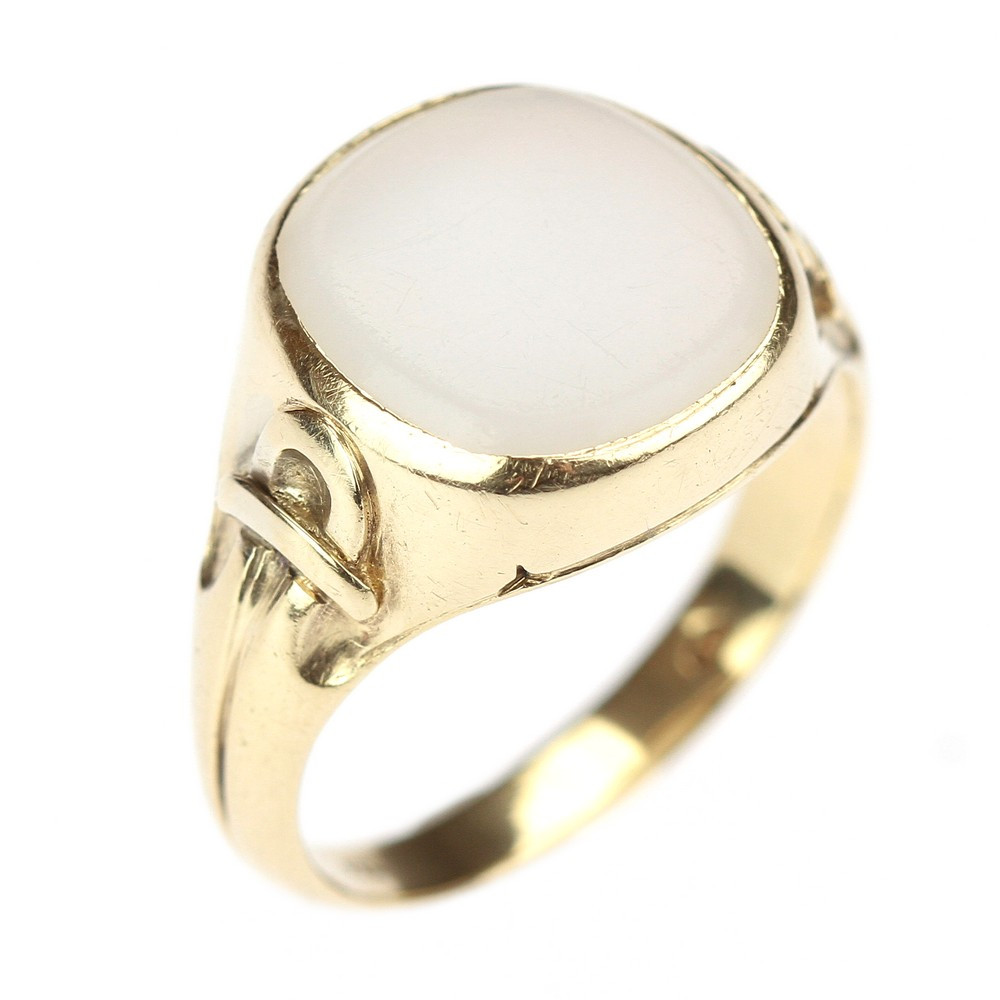 Masivní pánský prsten ze žlutého 14karátového zlata s ramínky zdobenými stylizovanou přezkou je osazen přírodním mléčným chalcedonem.