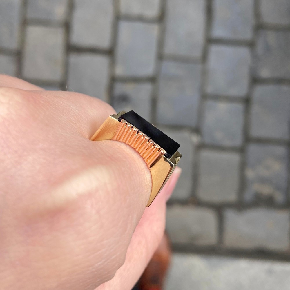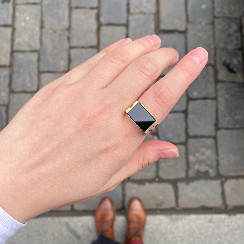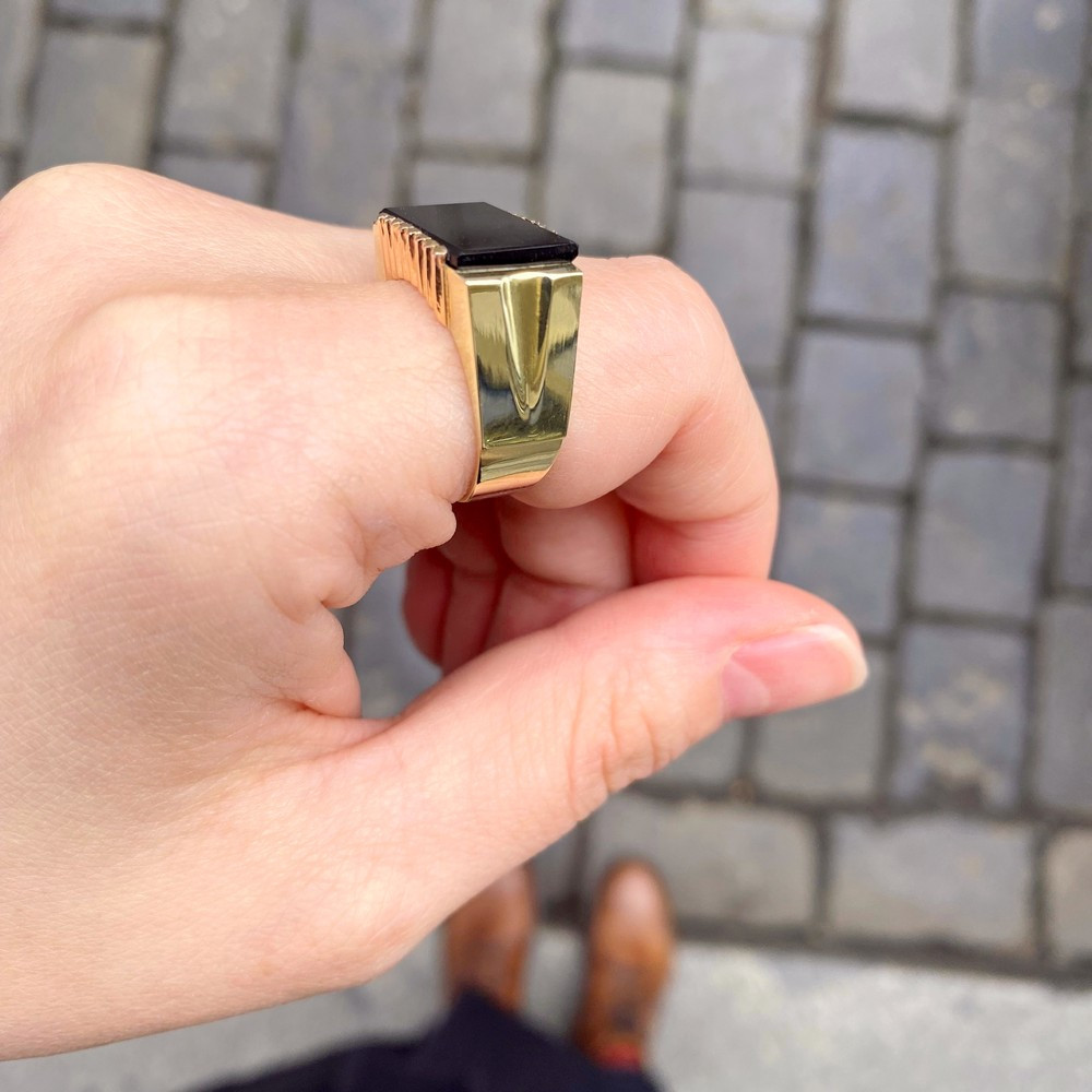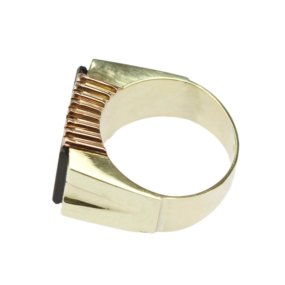 Pánský prsten ze žlutého 14karátového zlata, jehož ramínka jsou bohatě reliéfně zpracována. Ve středu prstenu je zasazena želvovinová kamej s jemně vyřezávaným profilem vojáka. Prsten je opatřen současnými českými puncovními značkami pro zlato 14 karátů, ryzostním číslem a mistrovskou značkou. Jedná se o moderní zlatnickou práci, samotná kamej je však...