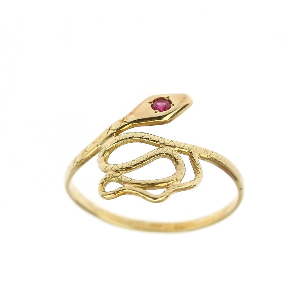 Prsten s hadím motivem ze žlutého 14karátového zlata se zasazeným syntetickým rubínem. Značeno novodobým puncem "labuť".