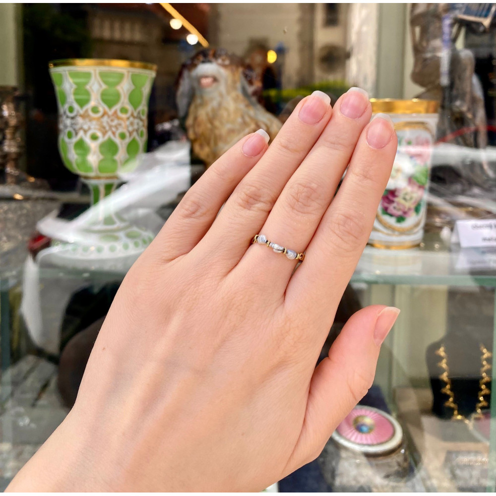 Prsten zhotovený ze žlutého 14karátového zlata. Přední, částečně pohyblivá strana prstenu je tvořena přírodními říčními perličkami a korálky navlečenými na drátku. Zadní strana je pevná a opatřená státním puncem "čejka" používaným mezi lety 1949-1992, ryzostním číslem "585" a mistrovskou výrobní značkou "MR".