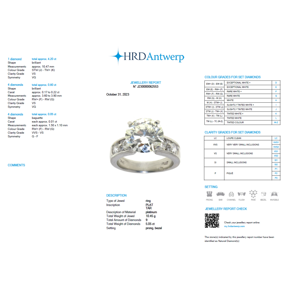 Luxusní prsten zhotovený z platiny se zasazeným diamantem briliantového brusu o hmotnosti 4,20 ct, barvy J-K a čistoty VS1. Šínu zdobí další čtyři diamanty briliantového brusu s celkovou hmotností 0,80 ct (4 × 0,17 ct - 0,22 ct; barva F-G; čistota VS1) a čtyři diamanty bagetového brusu s celkovou hmotností 0,05 ct (4 × 0,01 ct; barva F-G, čistota VVS-VS1). Prsten je certifikován špičkovou laboratoří HRD sídlící v Antverpách.
