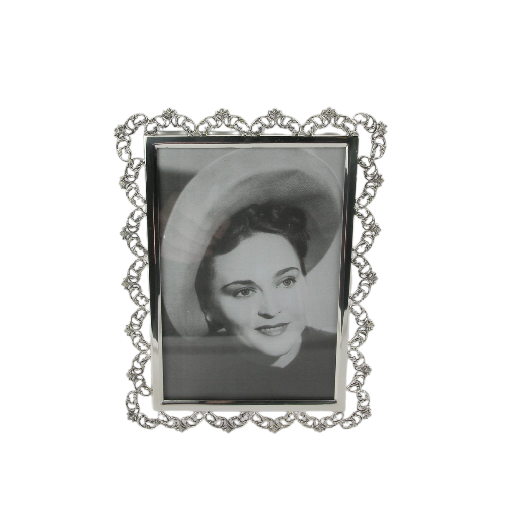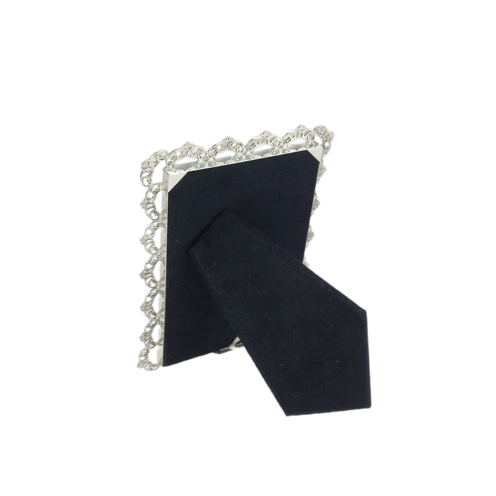 Menší rámeček na fotografie vyrobený ze stříbra vyšší ryzosti. Rám je bohatě zdobený, značený ryzostním číslem a českým puncem pro stříbro 925/1000. Zadní stranu tvoří modrý samet. Vložená fotografie je pouze ilustrační.