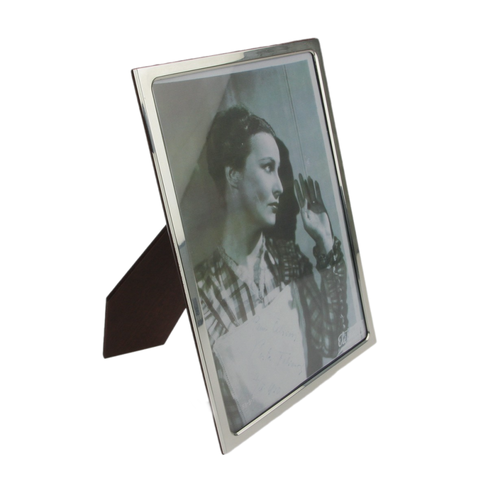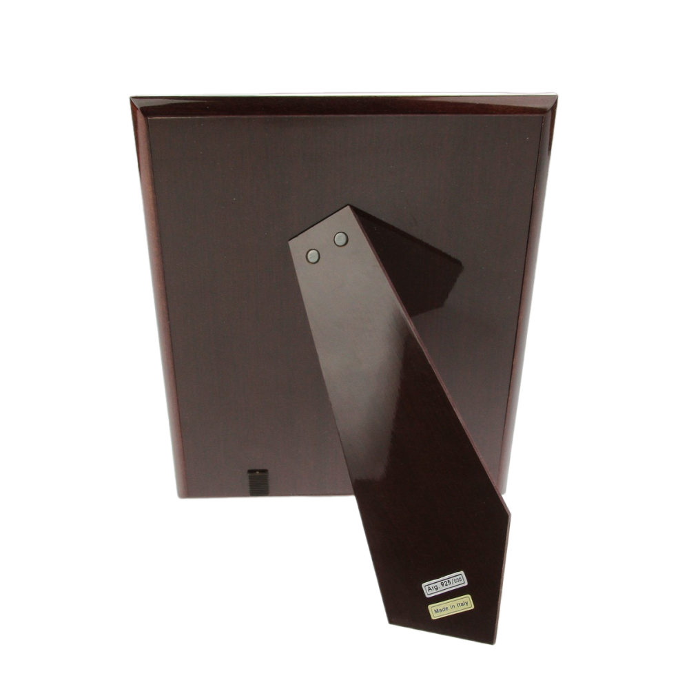 Středně velký hladký rámeček ze stříbra se zadní stranou z hnědého lakovaného dřeva. Jedná se o italskou práci, značeno českým puncem pro stříbro 925/1000 a ryzostním číslem. Přiložená fotografie je pouze ilustrační.
