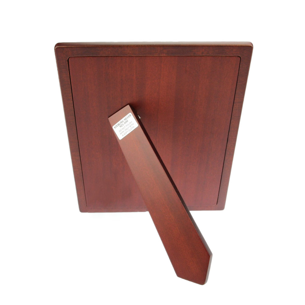 Středně velký zdobný rámeček ze stříbra se zadní stranou z hnědého matného dřeva. Jedná se o španělskou práci, značeno českým puncem pro stříbro 925/1000 a ryzostním číslem. Přiložená fotografie je pouze ilustrační.