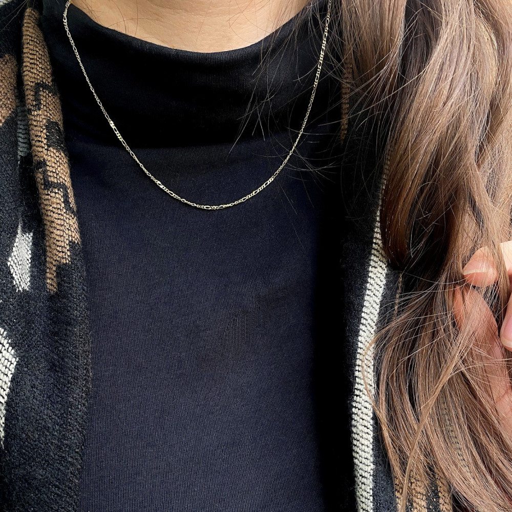 51,5 cm dlouhý řetízek ze žlutého 14karátového zlata. Jedná se o typ řetízku figaro, široký 2 mm. Zapínání na pružinový kroužek.