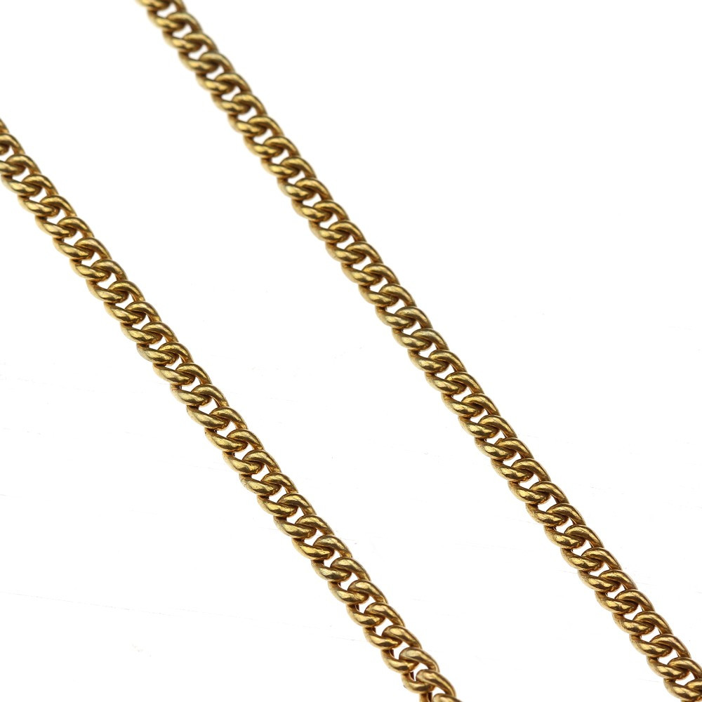 152 cm dlouhý řetěz, šatlén, zhotovený ze sytě žlutého 14karátového zlata. Posuvný jezdec na řetězu v secesním designu je osazen syntetickým rubínkem. Předmět je značen rakousko-uherským puncem "liška" a písmenem "C" (puncováno v Praze).