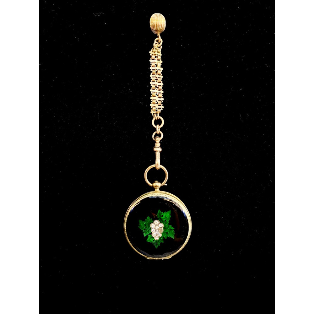 Šatlén, řetízek ke kapesním hodinkám, zhotovený z růžového 14karátového zlata ve 20. letech 20. století. Šperk si dochoval původní karabinku. Otevírací medailonek je zhotoven ze žlutého 14karátového zlata a je osazen přírodním diamantem briliantového brusu o váze 0,034 ct.