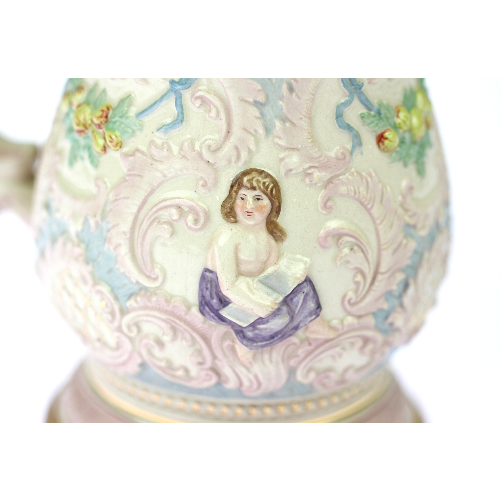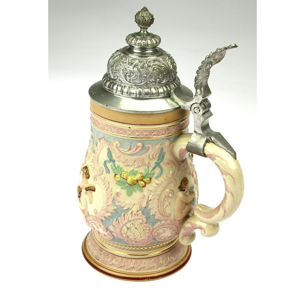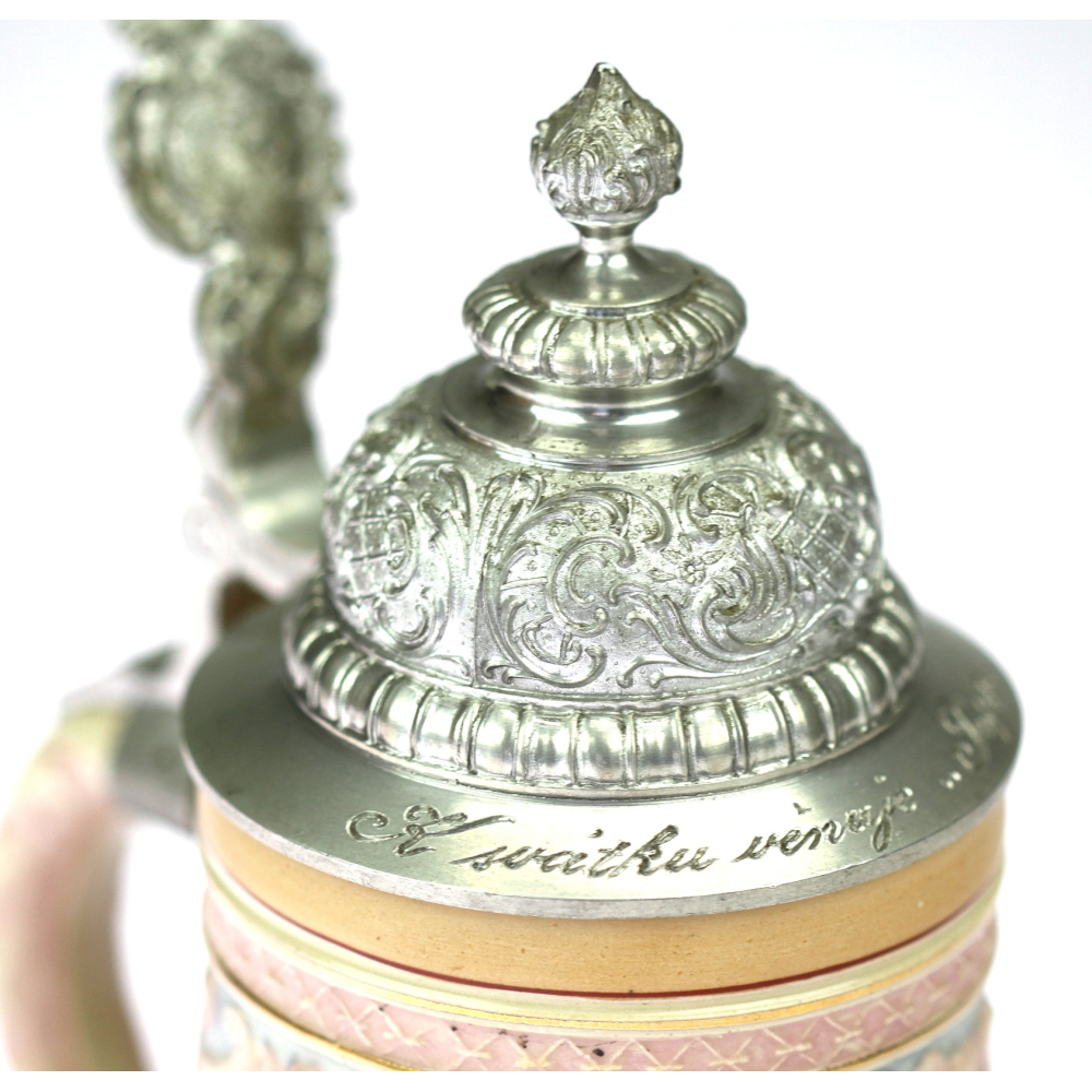 Keramická holba s cínovým poklopem, na němž je vyryto věnování.