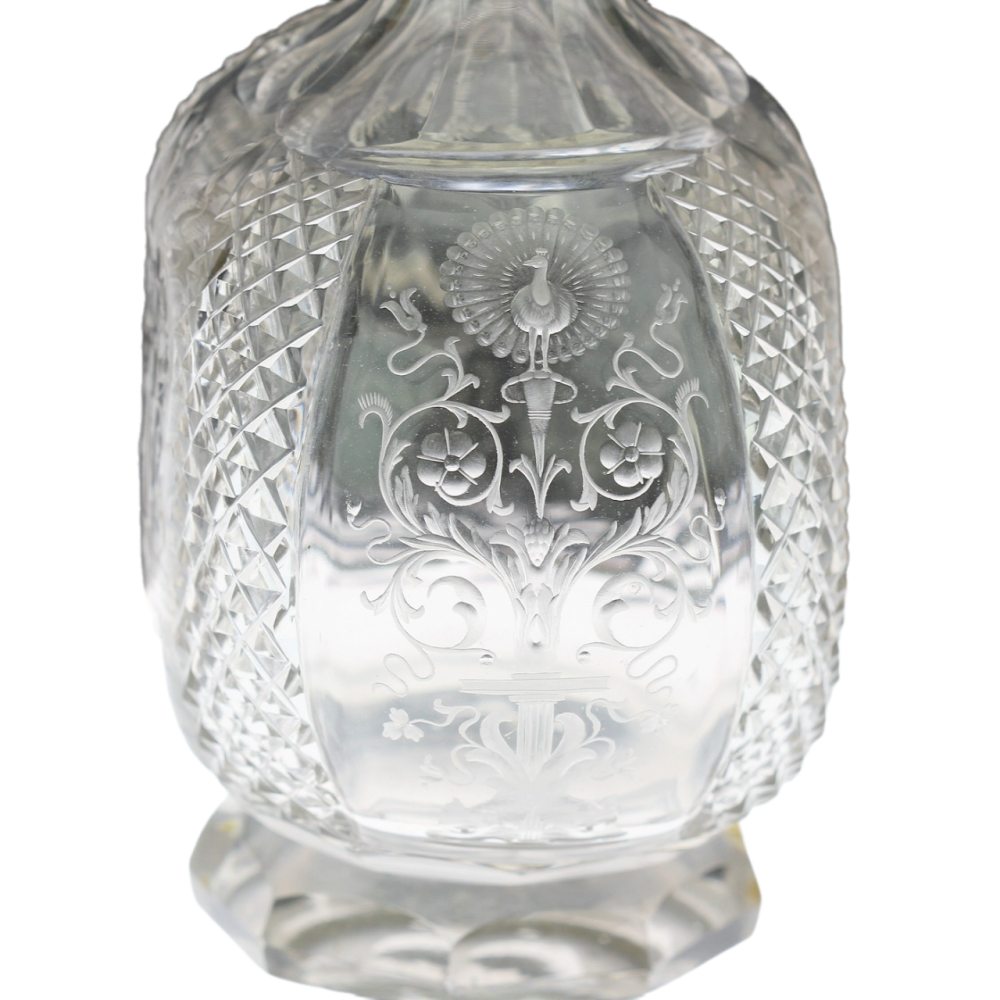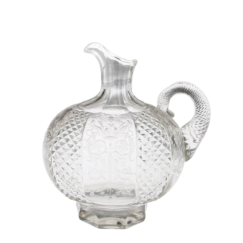 Broušená karafa z čirého skla, vyrobená na konci 19. století, zdobená rytými motivy inspirovanými renesančními náměty. Tyto dekorativní prvky odkazují na tvorbu proslulého sklářského rytce Dionysa Miseroniho, působícího na dvoře císaře Rudolfa II.