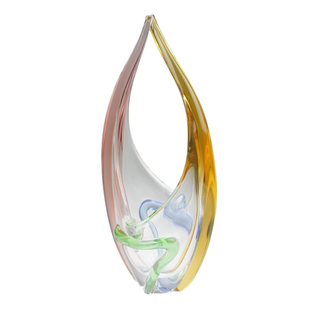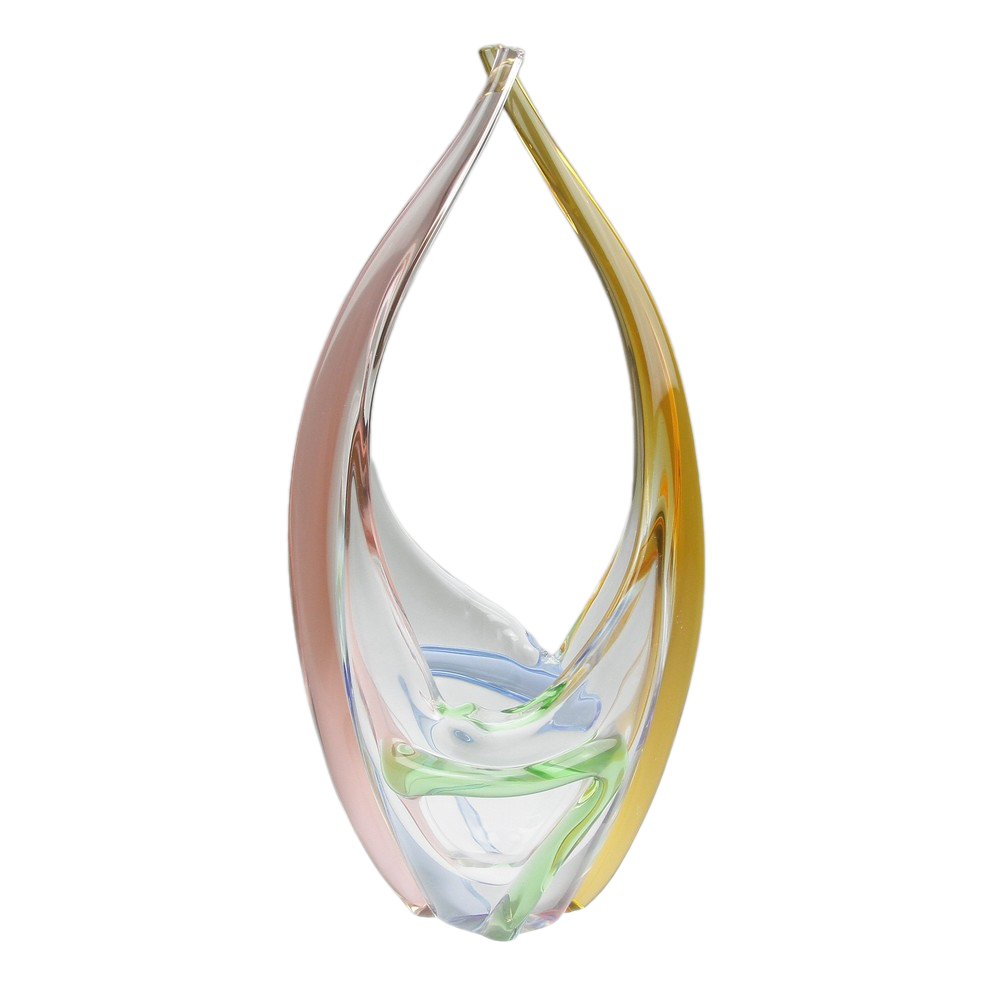 Krásná váza na jeden květ z hutního skla. Vnitřní detail je tvořen barevnými vinutými nitěmi, zajímavý kontrast pak vytváří zadní matná část vázy.