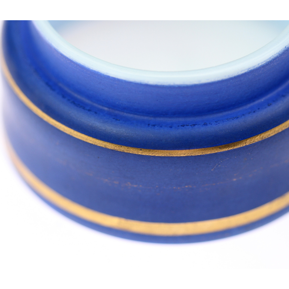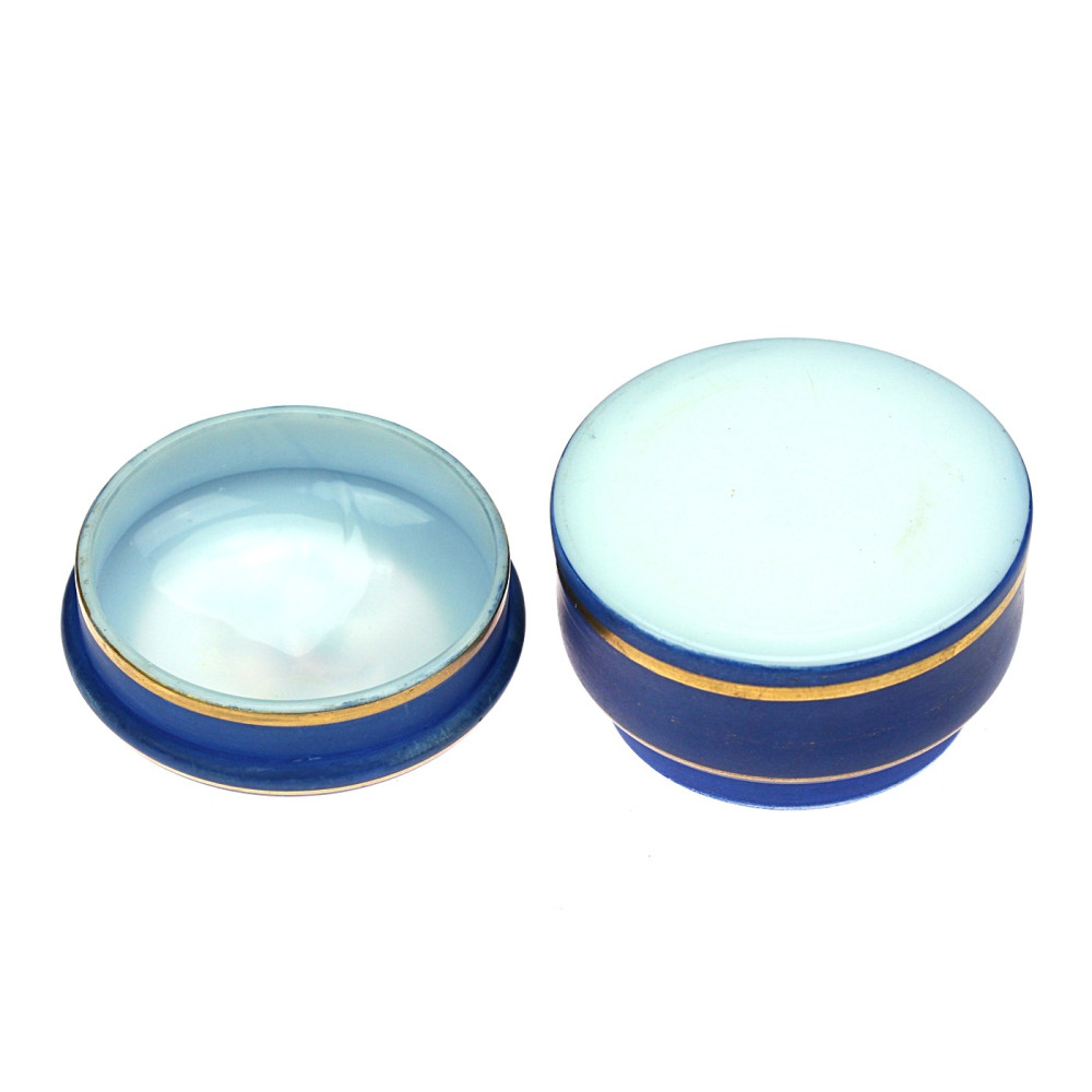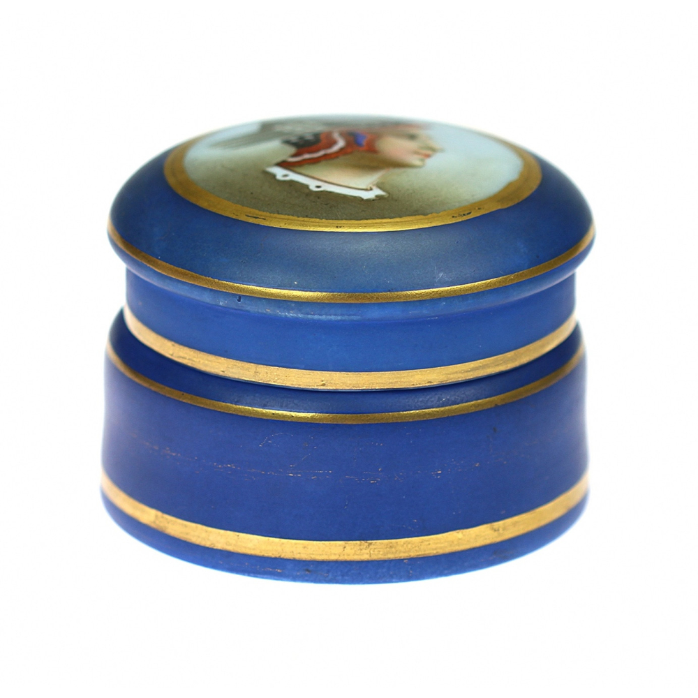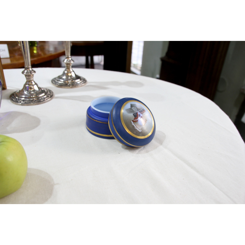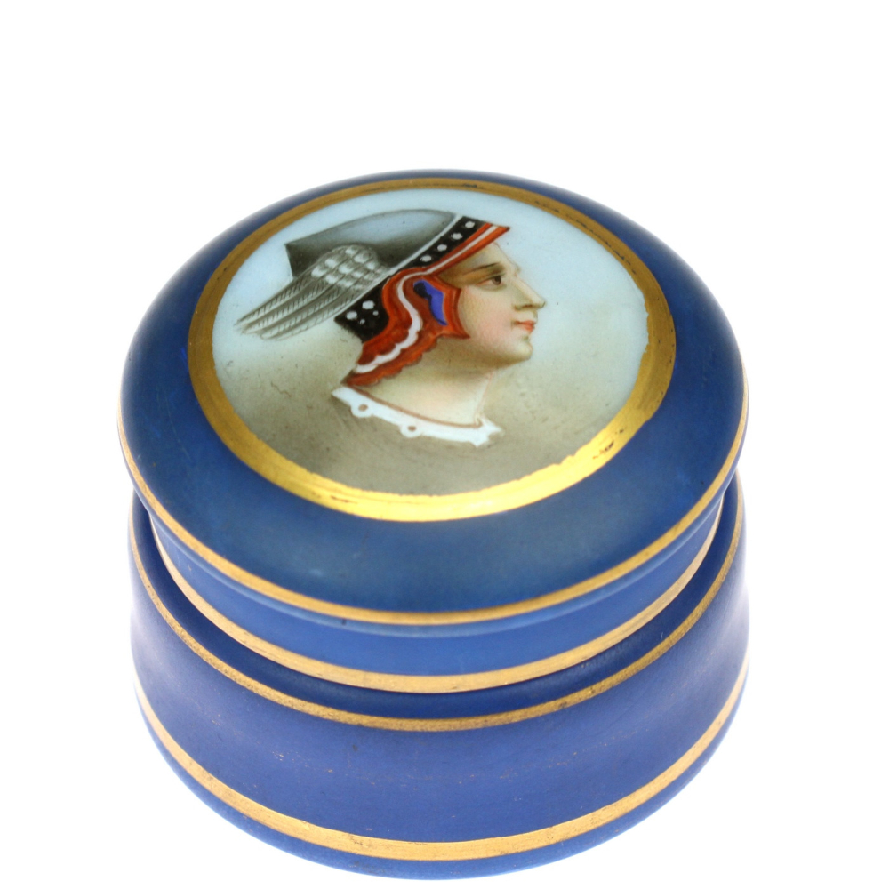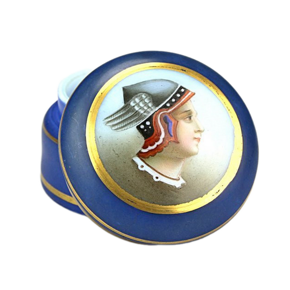 Jedná se o bílé opálové sklo foukané do formy, malované matným modrým emailem, zdobené taženou zlatou linkou a na víku malované barevnými smalty s námětem okřídlené mužské hlavy z profilu (bůh Merkur). Specializovanými malíři antických hlav byli v harrachovské sklárně Franz Veith a Vincenz Tietz. (Zdroj: MERGL, Jan a kol., Z Nového Světa do celého světa: 300 let harrachovského skla, Praha, 2012.)