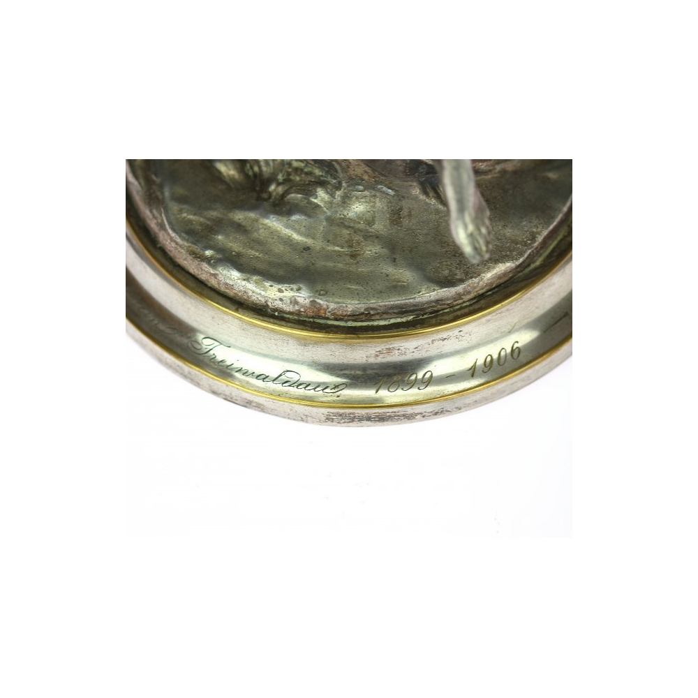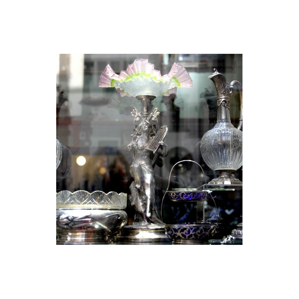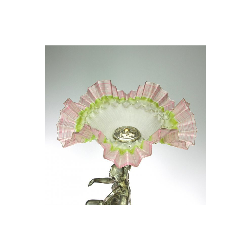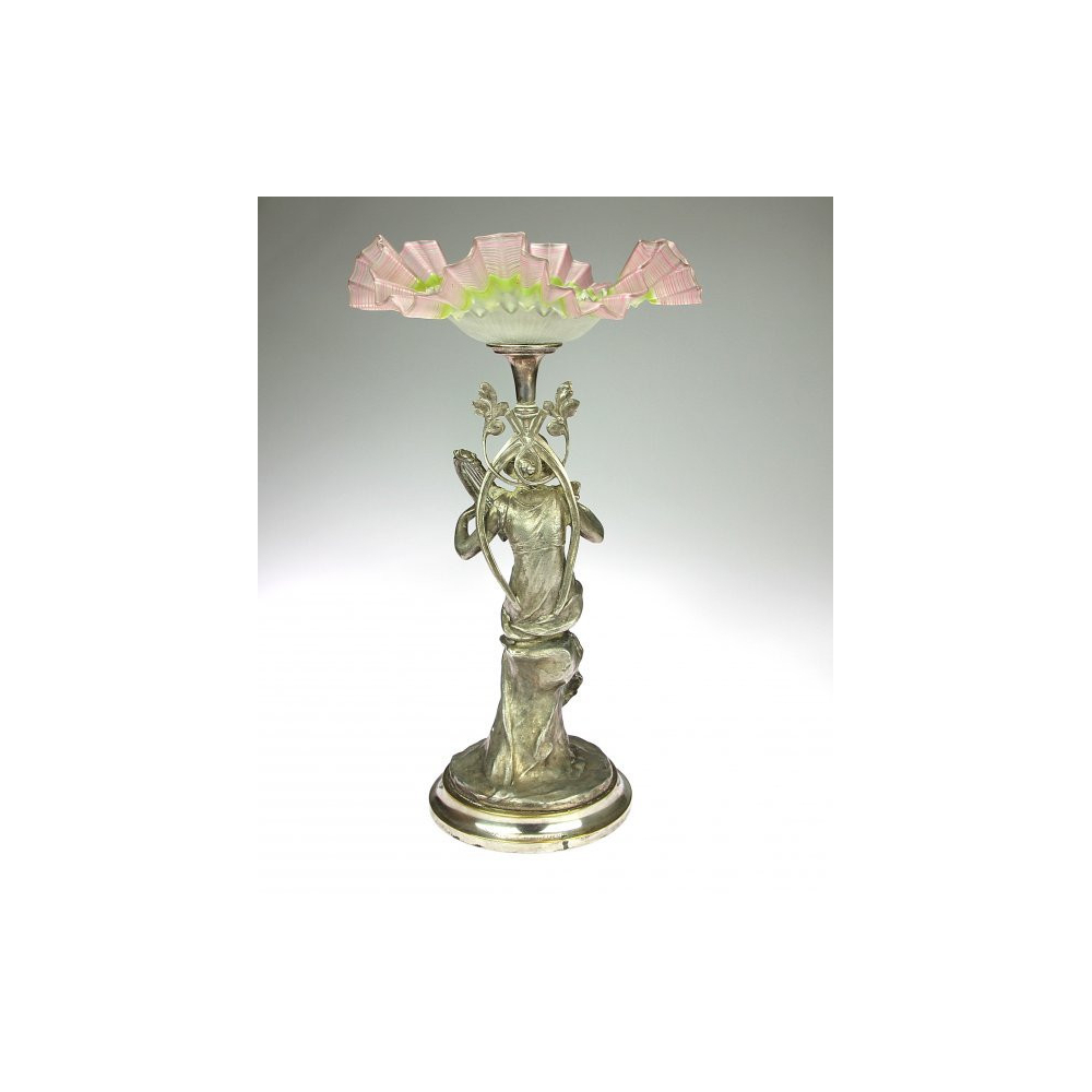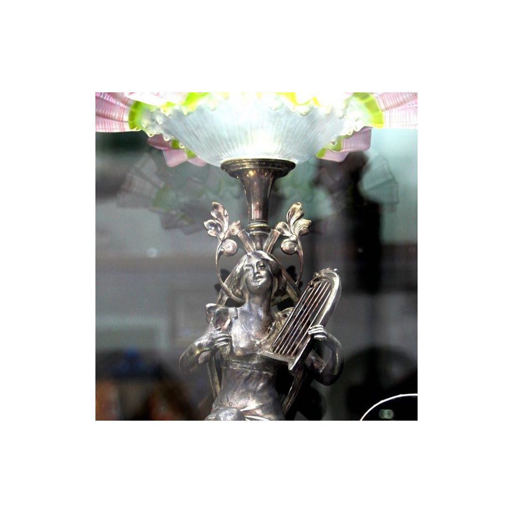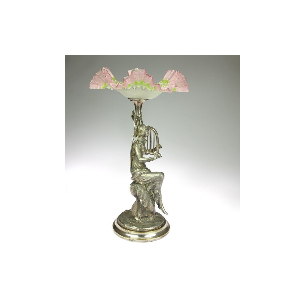 Secesní skleněný nástolec s montáží v podobě sochy dívky hrající na lyru. Na dolním okraji je přátelské věnování.